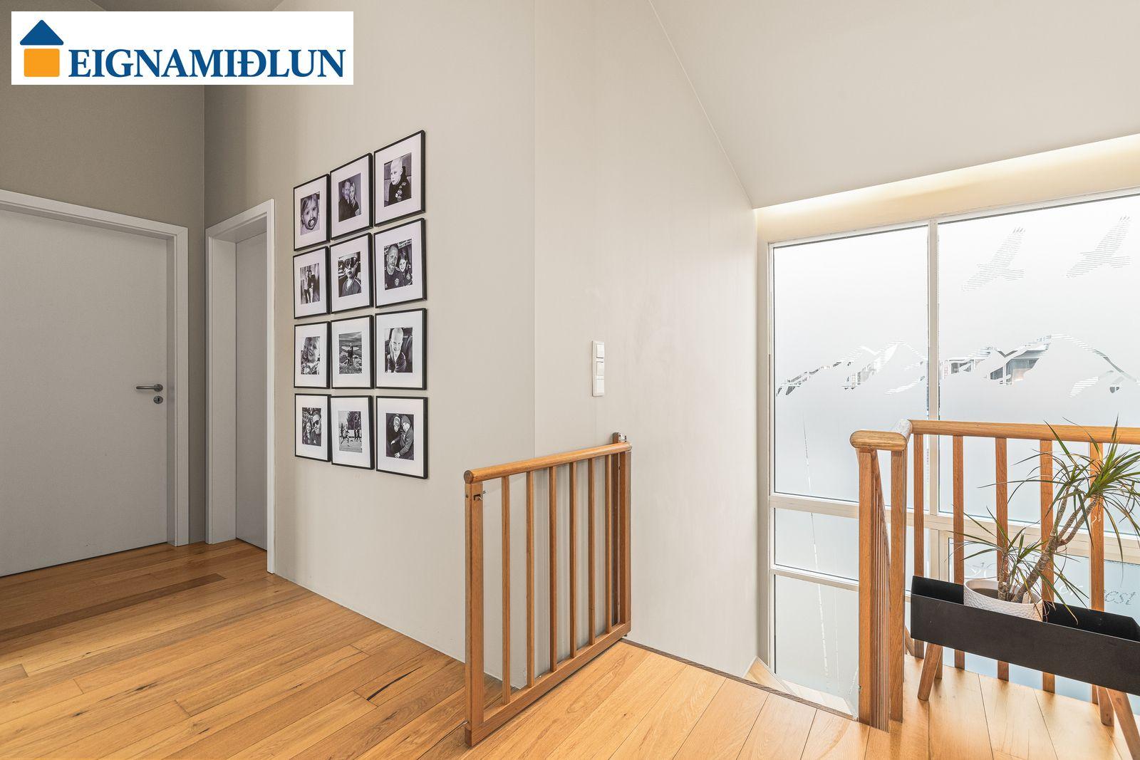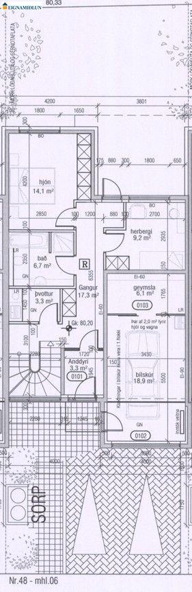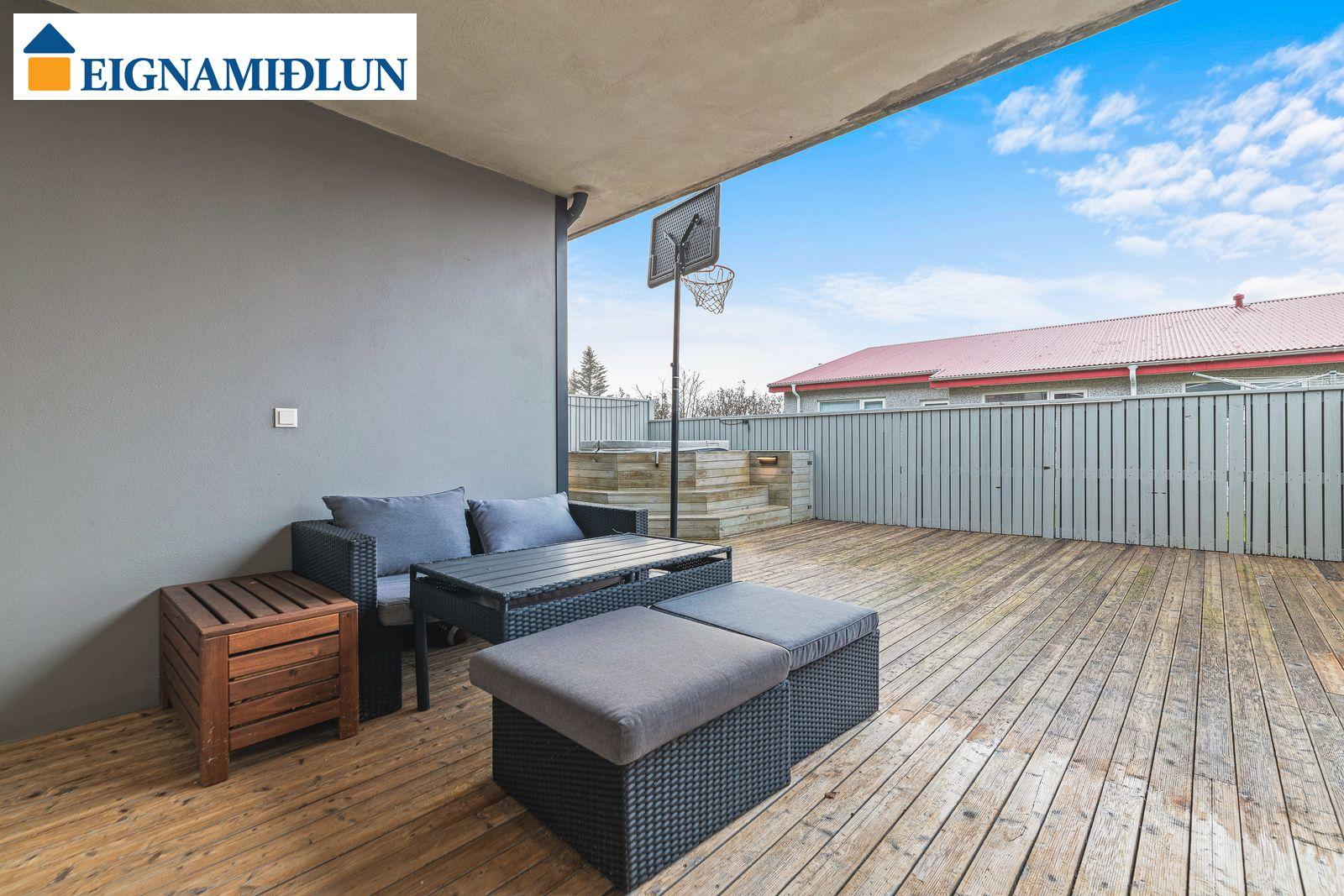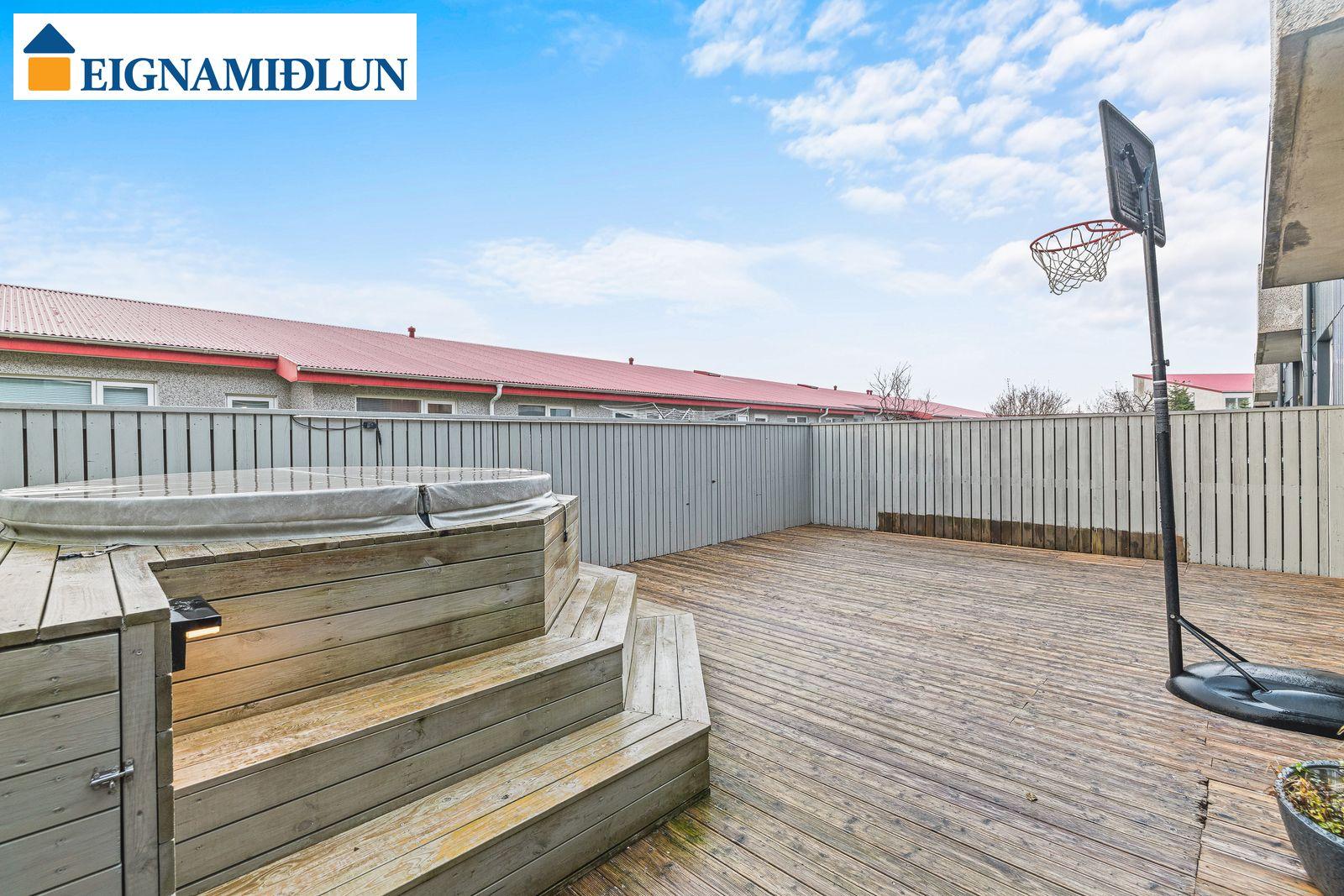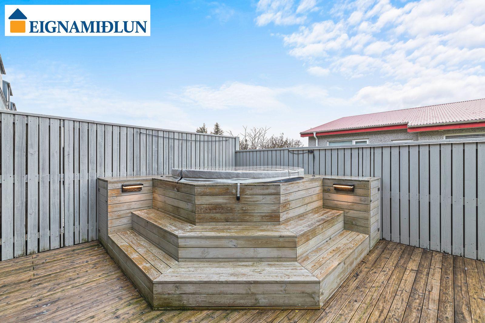228-6756, nánar tiltekið eign merkt 01-01. Neðri hæð er skráð 63,9 fm, efri hæð er skráð 79,8 fm og bílskúrinn er skráður 21,9 fm en innaf bílskúr er teiknuð sérgeymsla 6,8 fm sem ekki hefur verið stúkuð af þannig að bílskúrinn er því 28,7 fm. , birt heildarstærð 172.4 fm. Svalir eru út frá borðstofu efri hæðar til suðvesturs og eru skráðar 13,4 fm. Út frá neðri hæð er mjög stór timburverönd afgirt með heitum potti (hitaveitupottur)