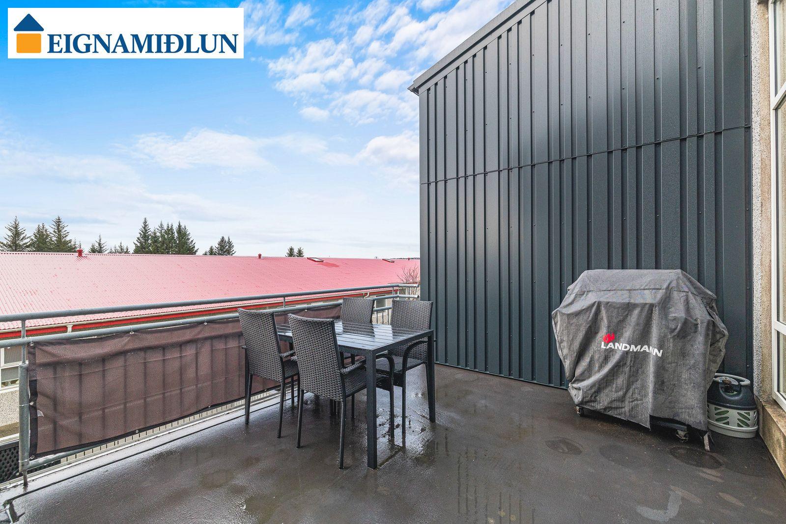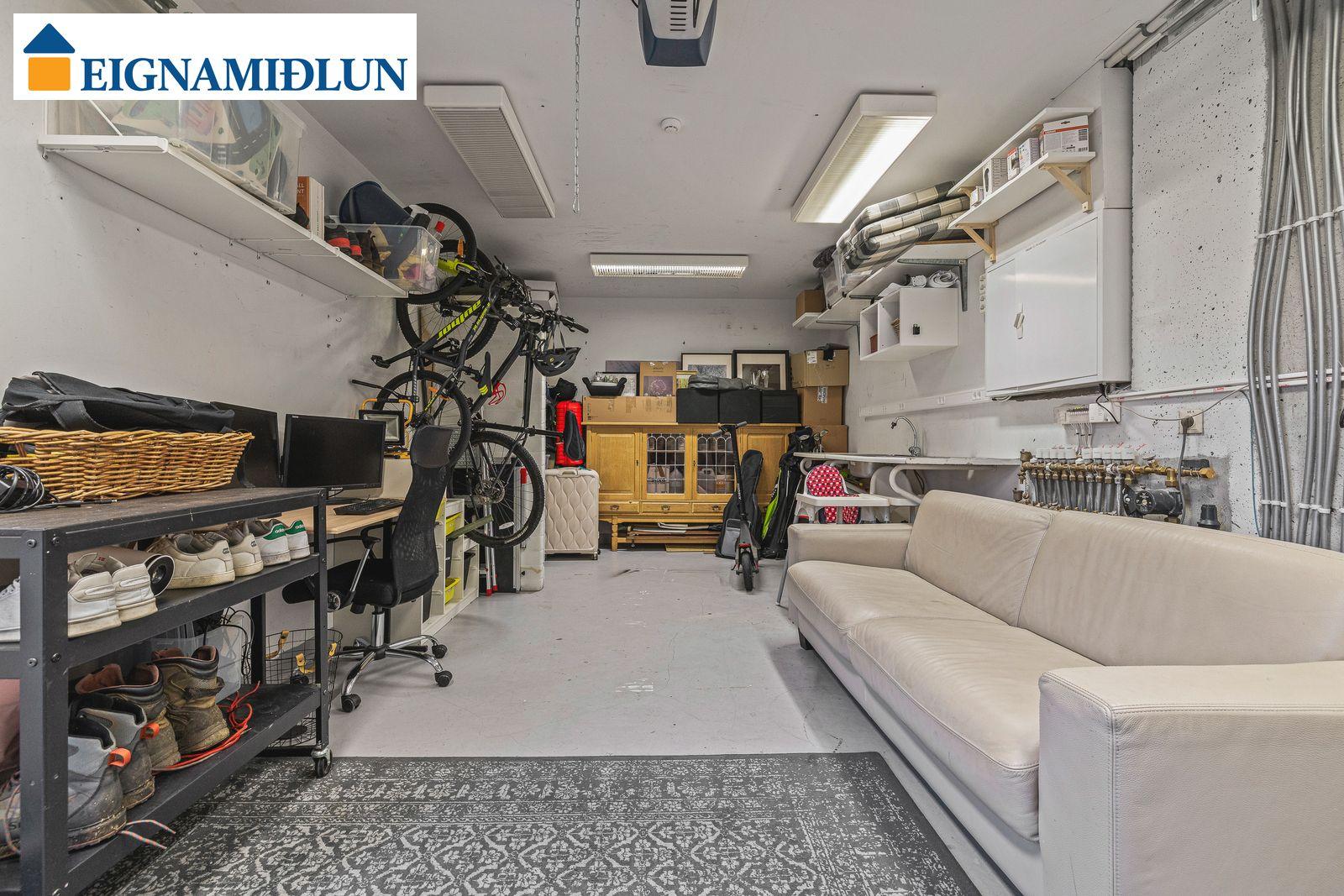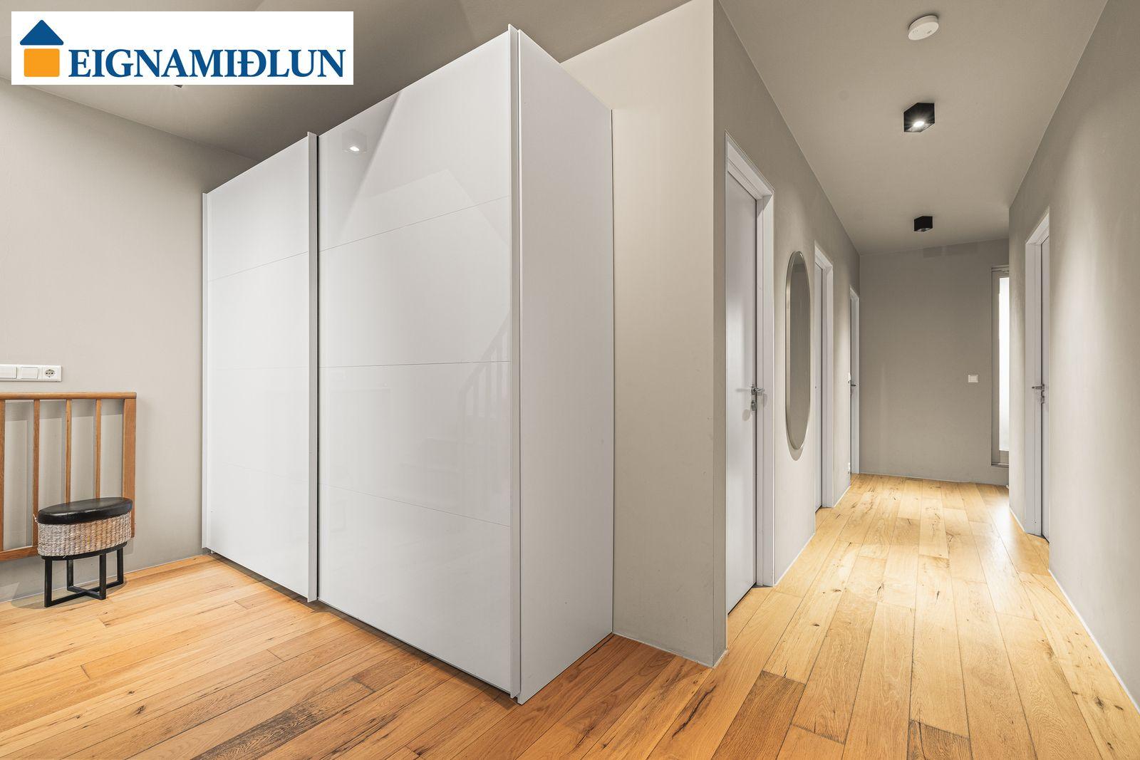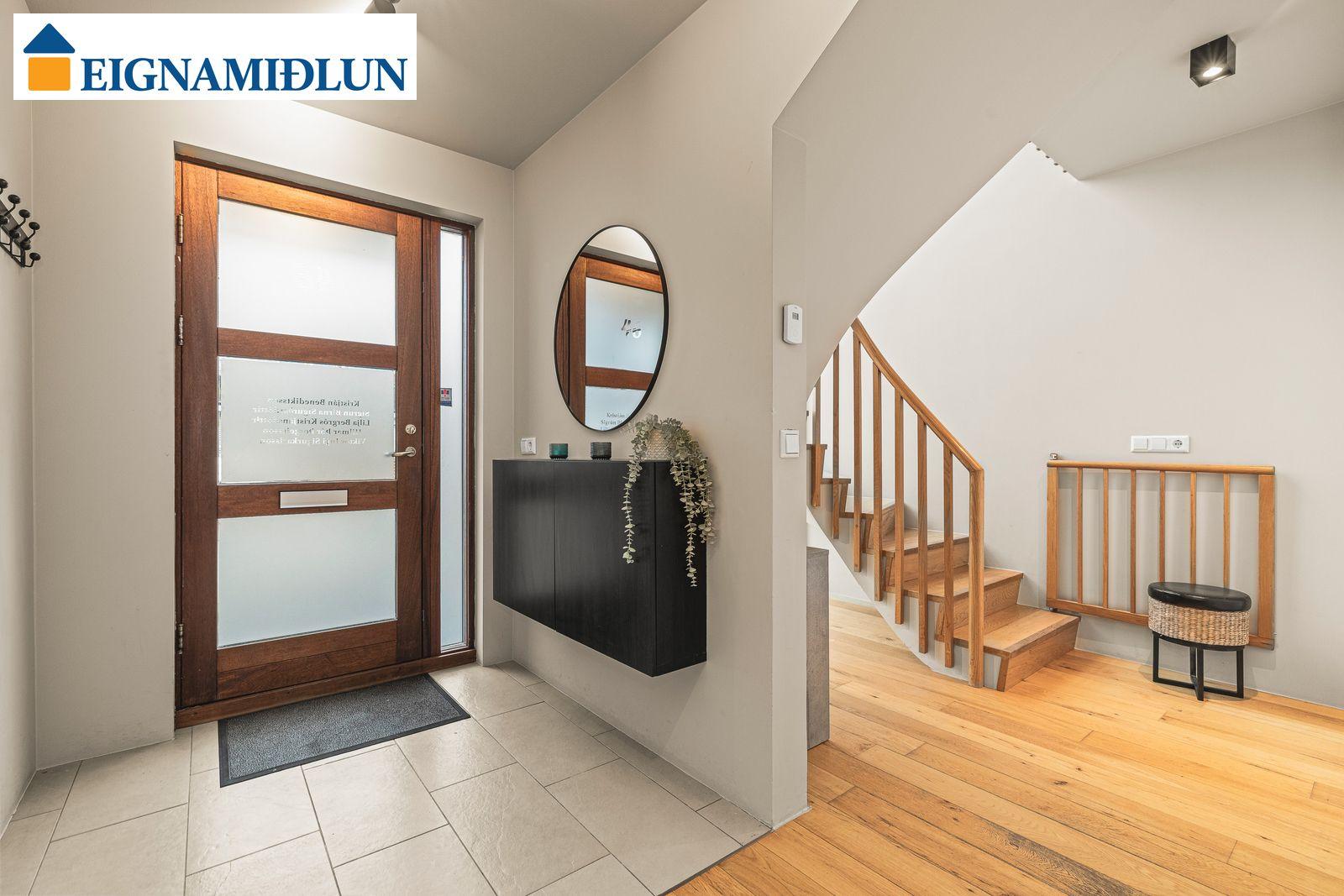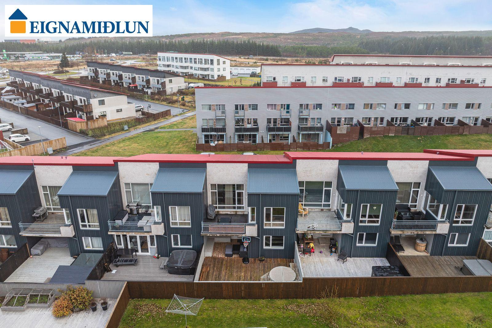 228-6756, nánar tiltekið eign merkt 01-01. Neðri hæð er skráð 63,9 fm, efri hæð er skráð 79,8 fm og bílskúrinn er skráður 21,9 fm en innaf bílskúr er teiknuð sérgeymsla 6,8 fm sem ekki hefur verið stúkuð af þannig að bílskúrinn er því 28,7 fm. , birt heildarstærð 172.4 fm. Svalir eru út frá borðstofu efri hæðar til suðvesturs og eru skráðar 13,4 fm. Út frá neðri hæð er mjög stór timburverönd afgirt með heitum potti (hitaveitupottur)