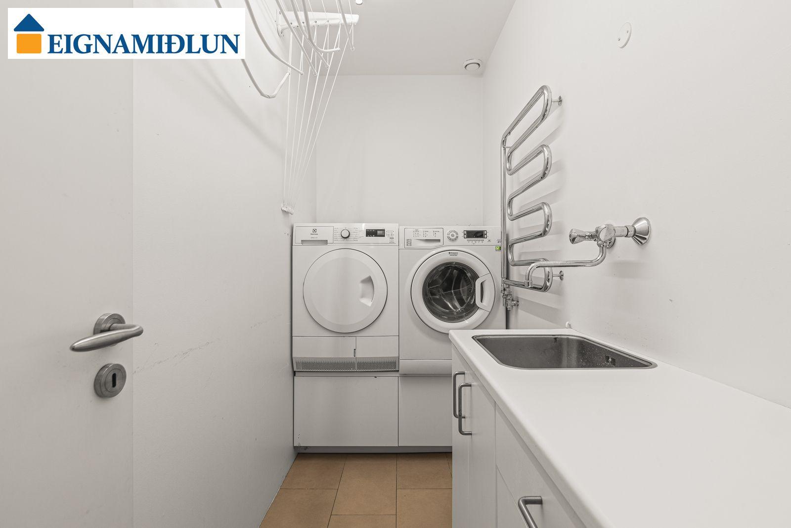 ÞVOTTAHÚS: Ágætlega rúmgott flísalagt þvottahús með innréttingu og handklæðaofni.