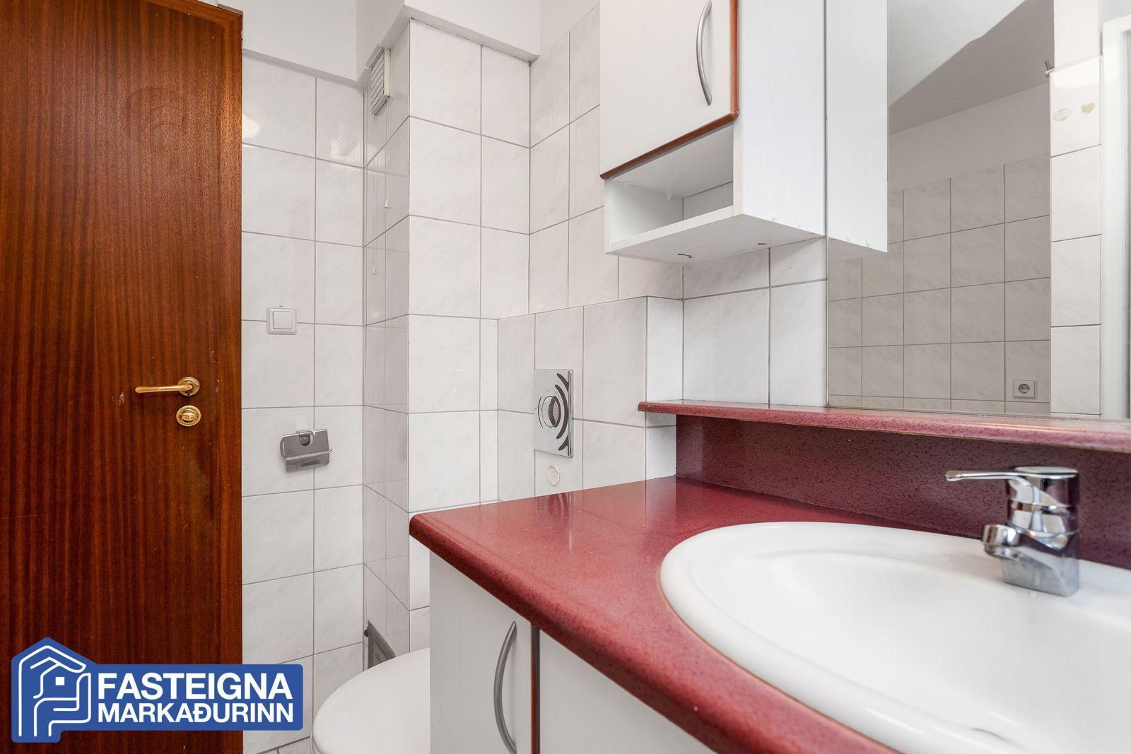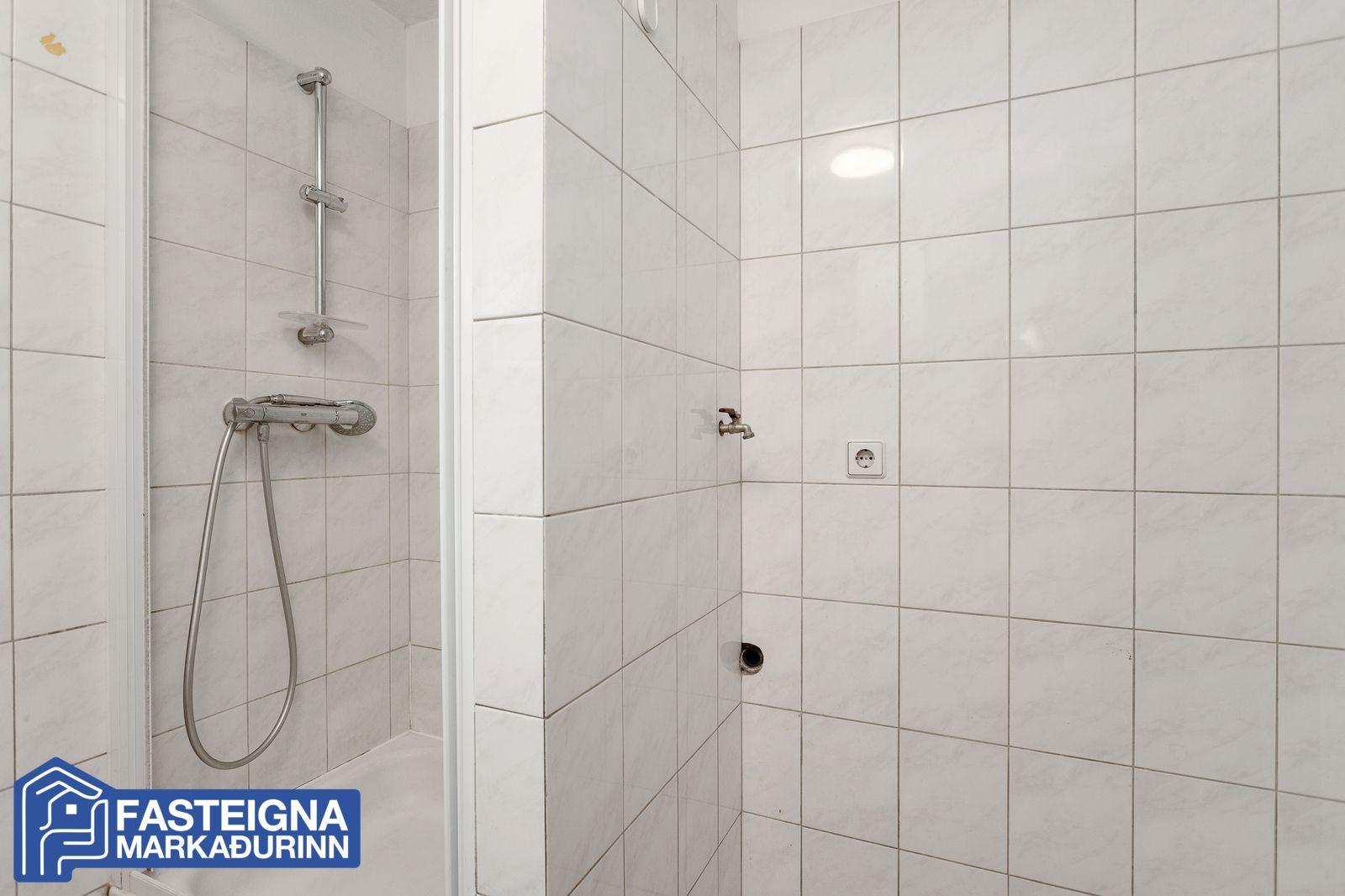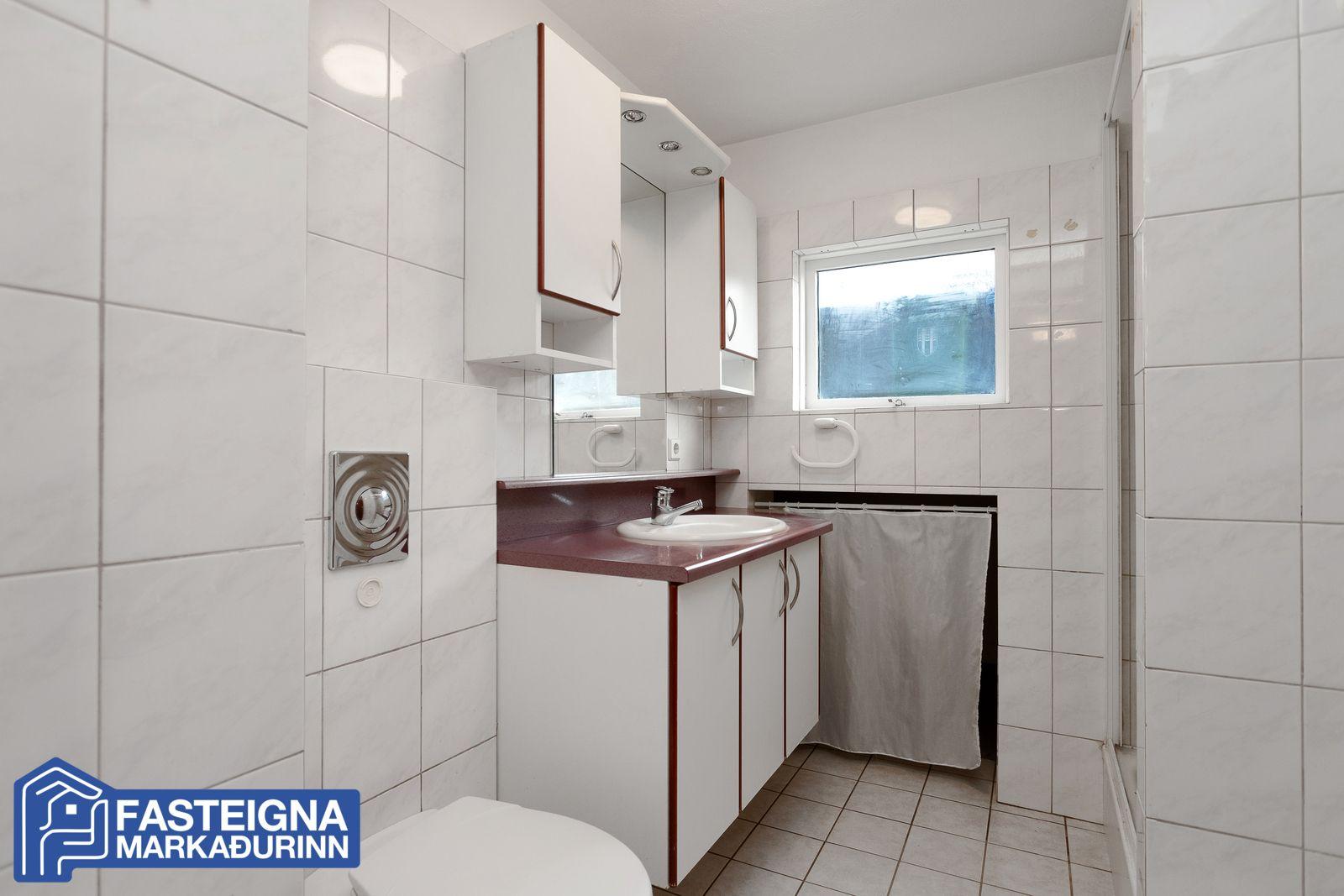 Baðherbergi, með glugga, flísalagt gólf, flísalagður sturtuklefi, upphengt wc, innrétting og geymlurými inn af sem er ekki í skráðum fermetrum eignar.