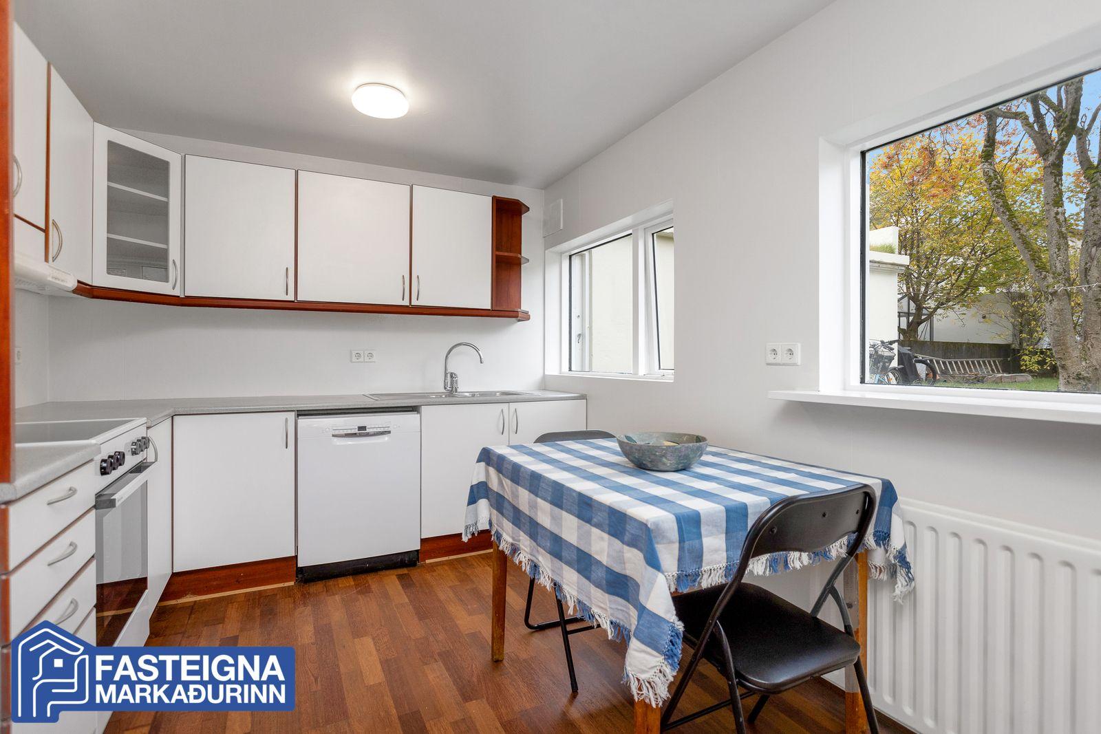 Eldhús, parketlagt, með fallegri hvítri innréttingu, nýrri eldavél, uppþvottavél og góðri borðaðstöðu.