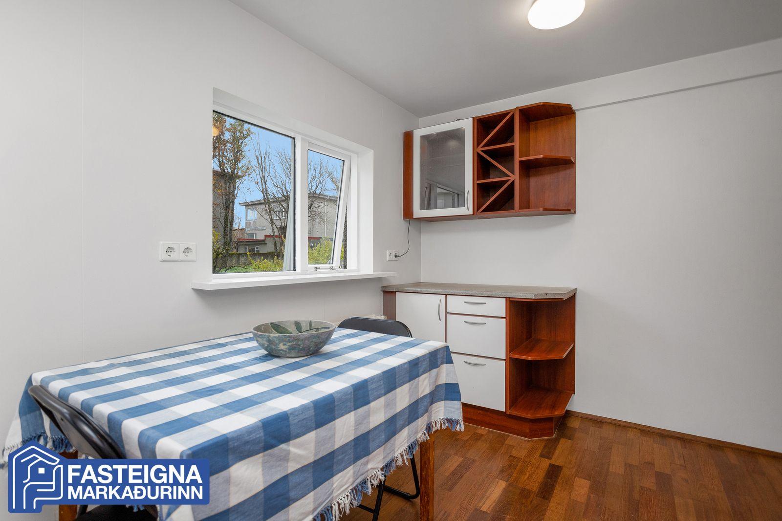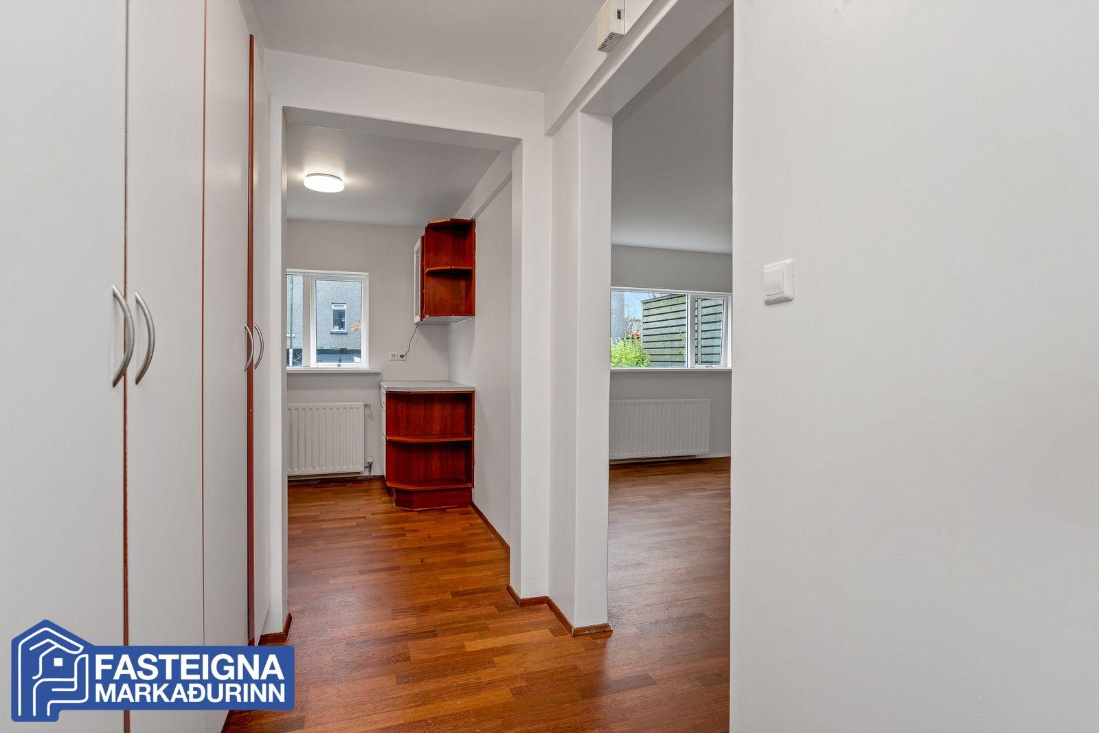 Eignin skiptist í inngang, forstofu, eldhús, stofu, svefnherbergi, baðherbergi og geymslu. Tengi er fyrir þvottavél og þurrkara á baðherbergi og er þar geymslurými inn af sem er ekki skráð í fermetrafjölda eignar.