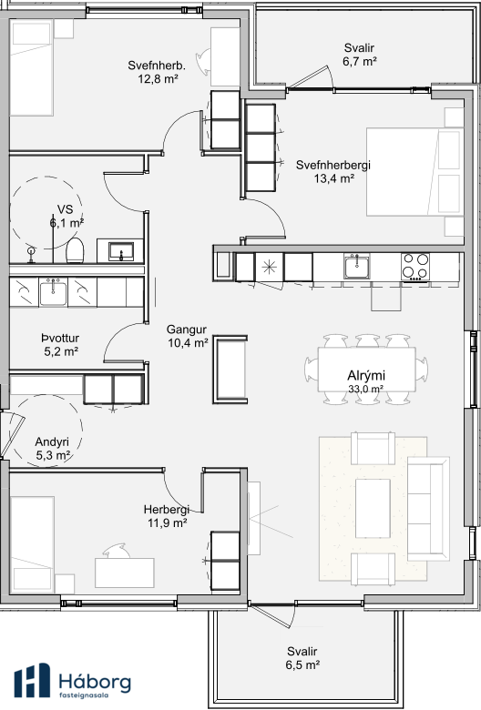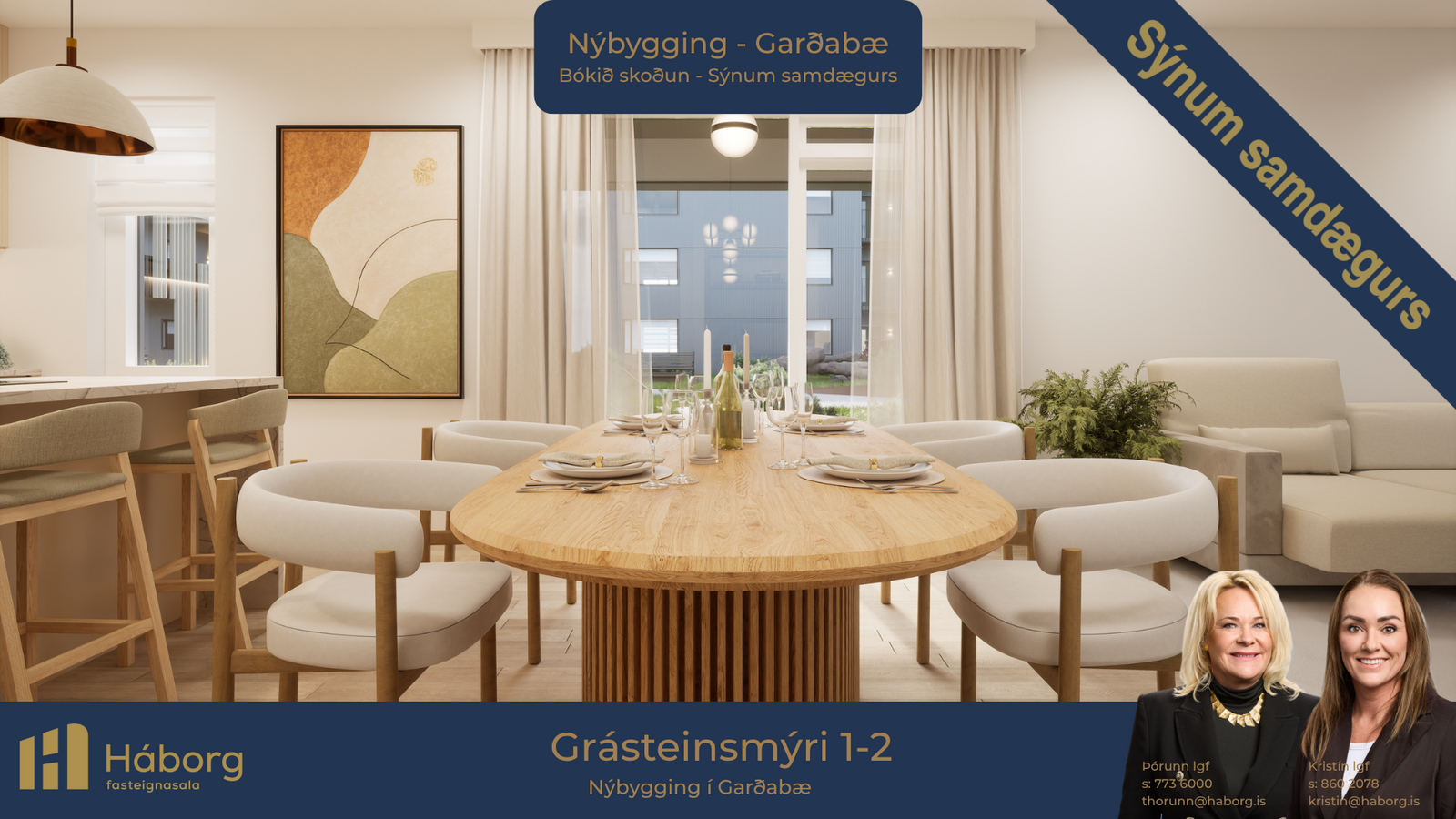 Háborg fasteignasala kynnir Grásteinsmýri 1, Garðabæ. Nýbyggingin er staðsteypt, einangruð að utan og klædd með ál- og bambus klæðningu. Góðar 2ja, 3ja 4ra og 5 herbergja íbúðir í litlu fjölbýli með lyftu. Útsýni er úr flestum íbúðum og timbur-verönd fylgir íbúðum á 1. hæð. Íbúðirnar afhendast án megin gólfefna en baðherbergi eru flísalögð að hluta. Næg bílastæði á lóð. Áætluð afhending íbúða er í mars-apríl 2026.Sölusíða GrásteinsmýriNýr valkostur í fjármögnun. Kaupendur geta nýtt sér nýjan sjóð Öxar 20 sem styður þá með því að fjárfesta með þeim allt að 20% af kaupverði. Kynntu þér málið hér Öxar.isNánari lýsing á íbúð 212 4ra herbergja: Stærð 123,9 fm. Sérinngangur af svölum. Þegar komið er í forstofu eru góðir fataskápar. Barnaherbergi tvö eru rúmgóð og björt með góðum fataskápum. Hjónaherbergi er einnig rúmgott og bjart með góðum fataskápum og með útgengi út á svalir. Baðherbergi er með góðri snyrtiaðstöðu. Sér þvottahús með góðri vinnuaðstöðu. Alrými er mjög rúmgott og bjart með opið eldhús. Stofur eru rúmgóðar og bjartar. Úr alrými og stofu er útgengt á svalir 6,5 fm að stærð. Eigninni fylgir stæði í bílakjallara merkt B24 og geymsla að stærð 8,3 fm.Nýjar, bjartar og vandaðar íbúðir með góðri lofthæð, þar sem náttúra, ró og nútímaleg hönnun mætast.Innréttingar í íbúðum: AXIS innréttingar í litnum CashmereGrey. AEG innbyggð heimilistæki, ísskápur, uppþvottavél, helluborð og bakarofn. Baðherbergi eru flísalögð að hluta með 60×60 Patch Beige flísum (Ragno). Grohe blöndunartæki eða sambærileg. Egill Árnason hurðir, lamir og hurðabúnaður.