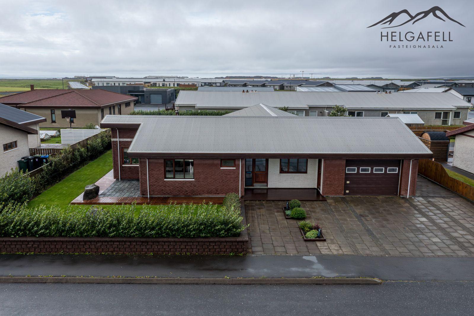Lóð: Húsið er klætt með Novabrick klæðningu. Gróinn og stór garður, stór pallur sem snýr til Suðvestur, heitur pottur, einnig er pallur og hellulagt meðfram öllu húsinu. Bílaplan er hellulagt.
