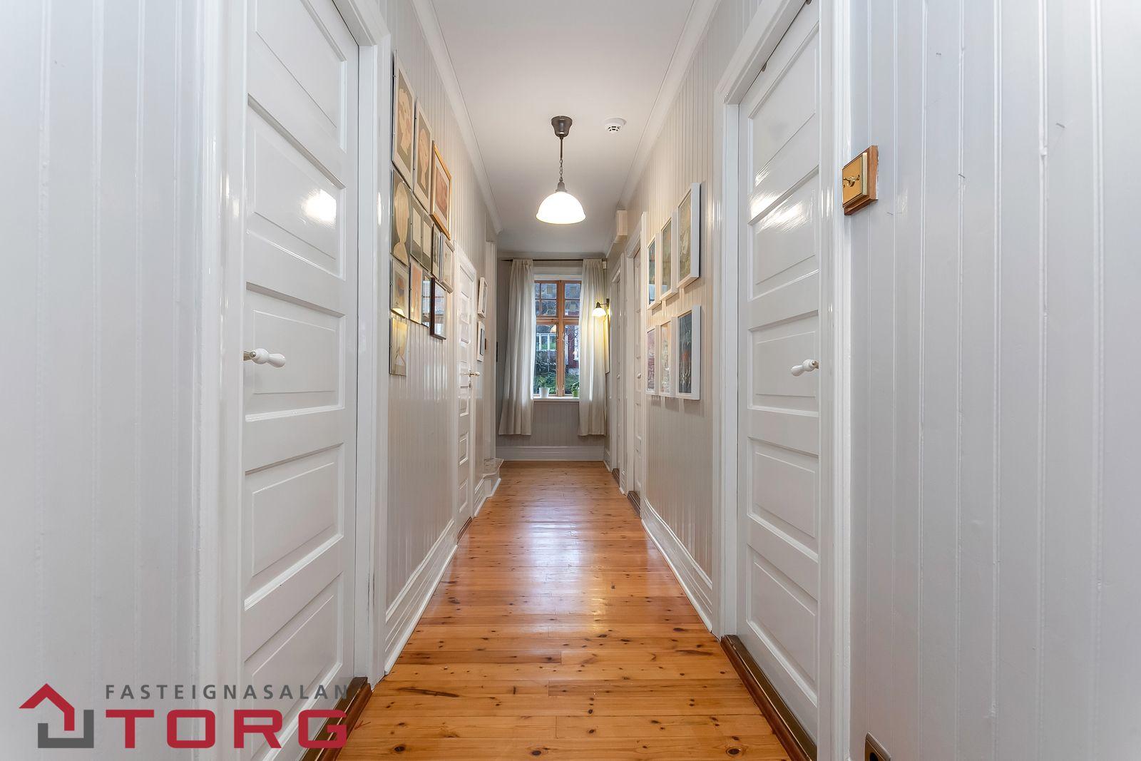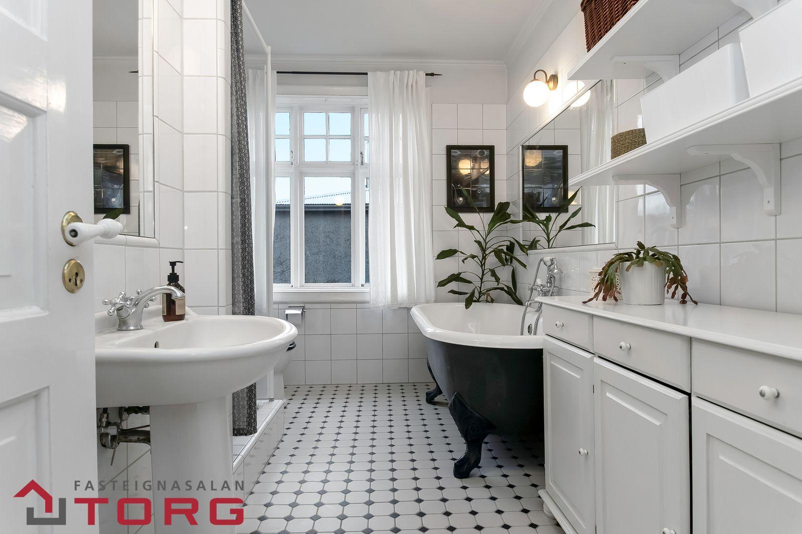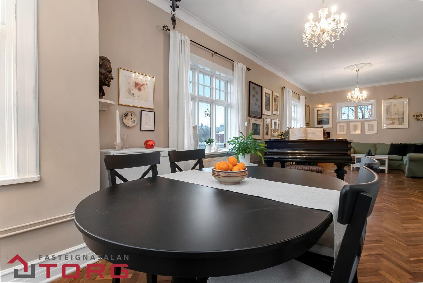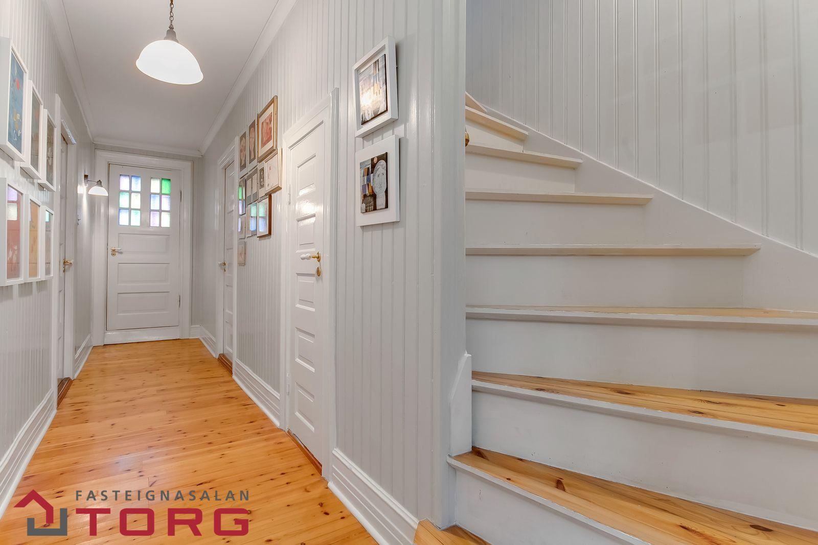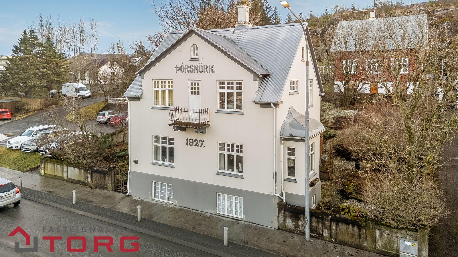 NÁNARI LÝSING : Mið hæð : komið er inn í flísalagða forstofu með fatahengi. Þaðan er komið inn í rúmgott hol með náttúruflísum á gólfi. Rúmgóð og björt stofa og borðstofa með fiskabeina parketi á gólfi. Mjög fallegir kverklistar og rósettur í loftum, fiskabeinaparketi á gólfum. Gluggar á þrjá vegu. Eldhúsið var endurnýjað fyrir um 20 árum síðan. Sér smíðuð innréttingu með miklu skápa plássi, flísar á milli skápa, mahogny borðplötur, stór gaseldavél, tengi fyrir uppþvottavél, náttúruflísar á gólfi. Opið er inn í borðstofu frá eldhúsi. Efri Hæð : Frá holi miðhæðar er rúmgóður stigi upp á efri hæðina. Komið er upp á gang með parketi á gólfi, við enda gangsins er útgengt út á litlar svalir sem snúa út að læknum. Rúmgott hjónaherbergi með fataherbergi innaf, parket á gólfi. Annað rúmgott herbergi með parketi á gólfi. Baðherbergi með sturtuklefa og fallegu standandi pottjárns baðkari, flísar á gólfi og veggjum. Gott þvottahús með dúk á gólfi. Innbyggðum geymsluskápur undir stiga. Efsta hæð : Frá holi miðhæðar er stigi upp á rishæðina. Komið er upp í rúmgott sjónvarpshol með gluggum á tvo vegu. Möguleiki á að útbúa gott svefnherbergi. Stórt svefnherbergi með parketi á gólfi. Annað minna herbergi með parketi á gólfi. Kjallari : Frá holi miðhæðar er steyptur stigi niður í kjallarann. Komið er í rúmgott hol með skápum. Mjög rúmgott herbergi/stofa með parketi á gólfi. Innaf því er annað rúmgott herbergi með parketi á gólfi. Baðherbergi með sturtuklefa, flísar á gólfi. Mjög rúmgóð geymsla er inn af holi. Annað : Búið er að skipta um alla glugga í húsinu fyrir utan 2 í risi. Einnig hafa frárennsislangir verðið endurnýjaðar og dren langir einnig. Skipt var um járn á þaki fyrir ca. 25 árum síðan.