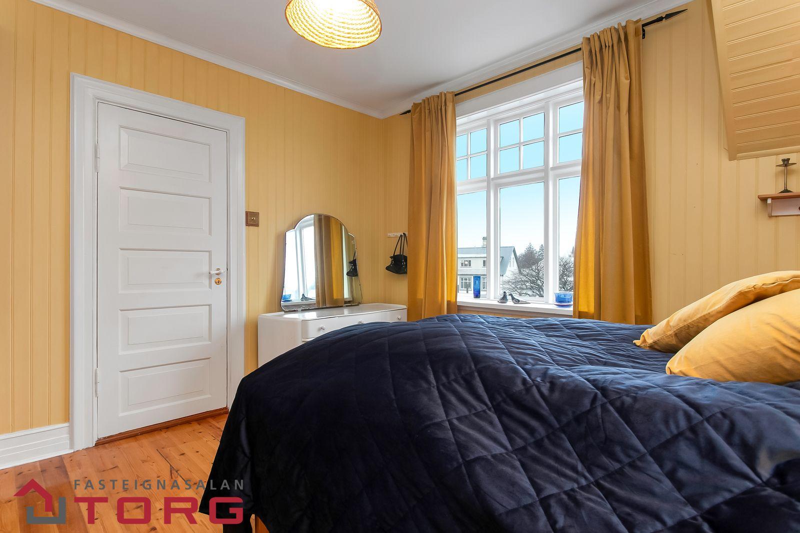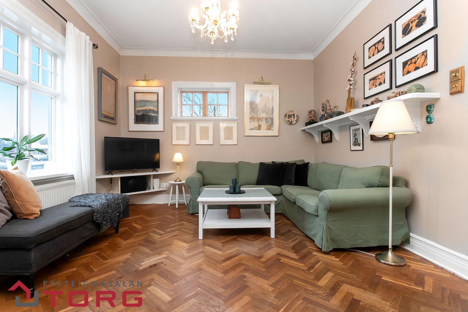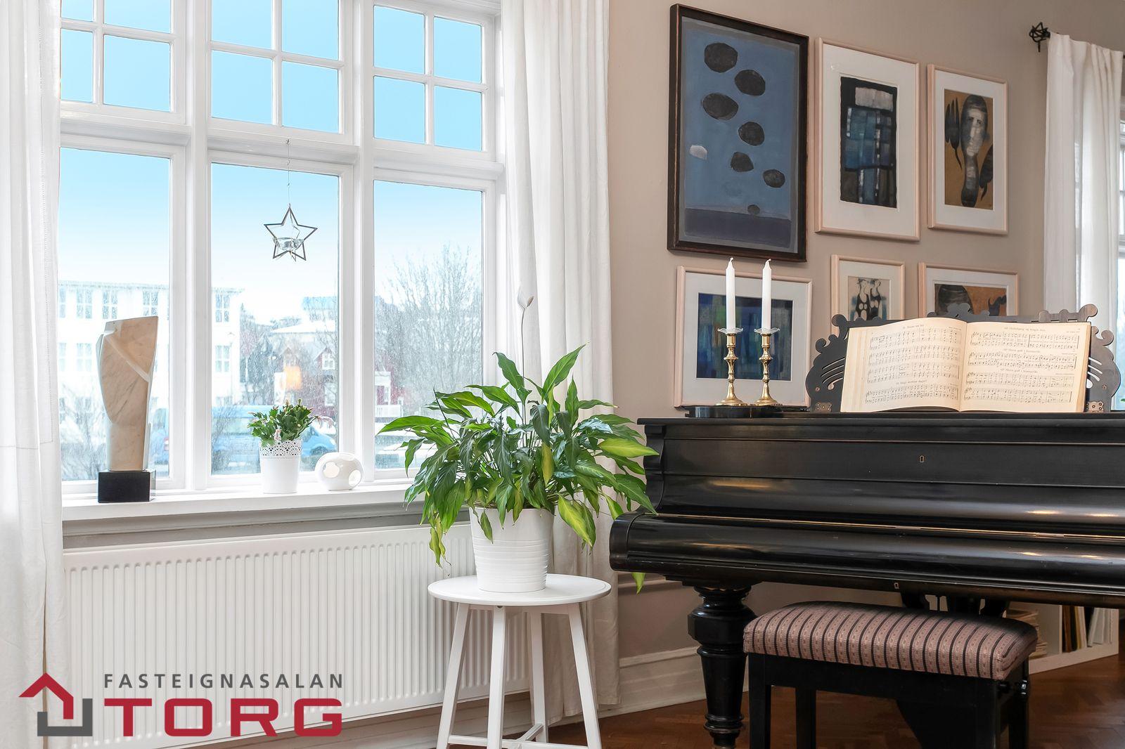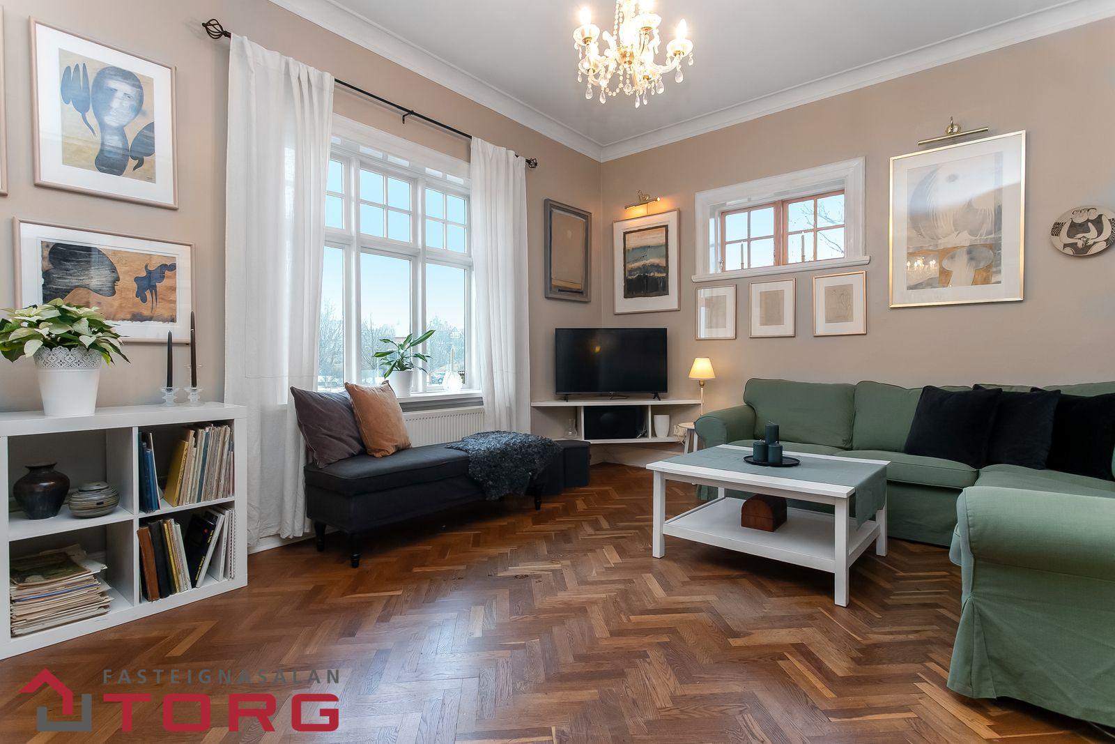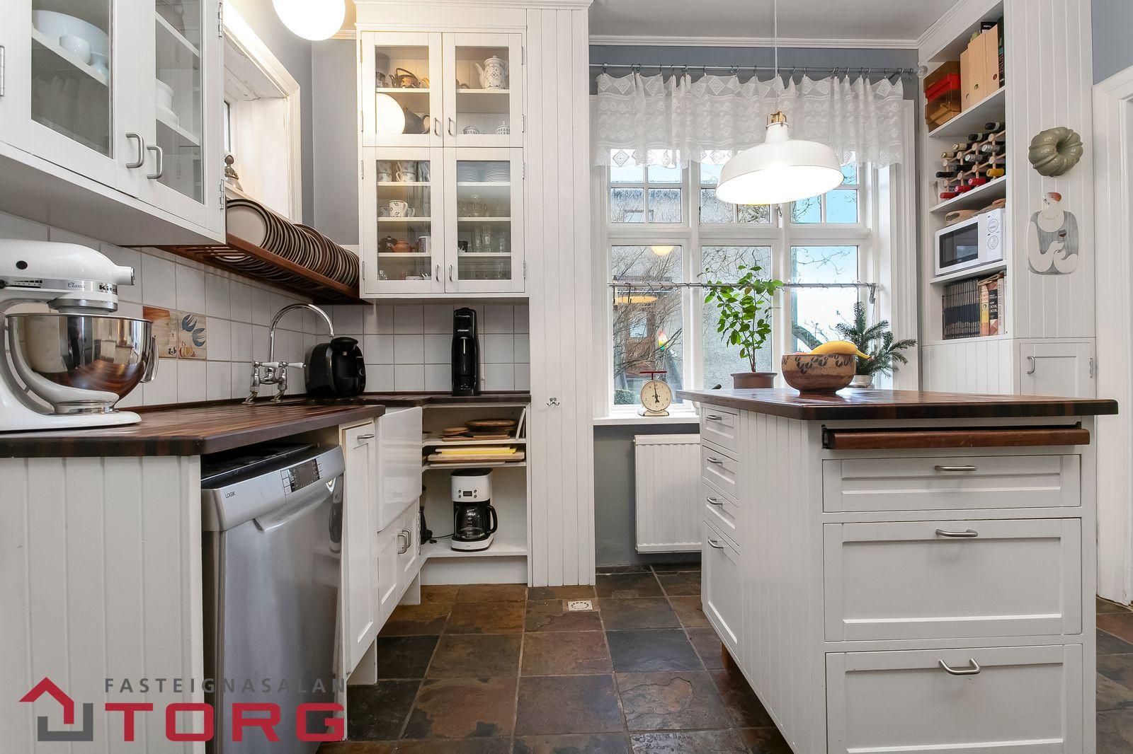 NÁNARI LÝSING : Mið hæð : komið er inn í flísalagða forstofu með fatahengi. Þaðan er komið inn í rúmgott hol með náttúruflísum á gólfi. Rúmgóð og björt stofa og borðstofa með fiskabeina parketi á gólfi. Mjög fallegir kverklistar og rósettur í loftum, fiskabeinaparketi á gólfum. Gluggar á þrjá vegu. Eldhúsið var endurnýjað fyrir um 20 árum síðan. Sér smíðuð innréttingu með miklu skápa plássi, flísar á milli skápa, mahogny borðplötur, stór gaseldavél, tengi fyrir uppþvottavél, náttúruflísar á gólfi. Opið er inn í borðstofu frá eldhúsi. Efri Hæð : Frá holi miðhæðar er rúmgóður stigi upp á efri hæðina. Komið er upp á gang með parketi á gólfi, við enda gangsins er útgengt út á litlar svalir sem snúa út að læknum. Rúmgott hjónaherbergi með fataherbergi innaf, parket á gólfi. Annað rúmgott herbergi með parketi á gólfi. Baðherbergi með sturtuklefa og fallegu standandi pottjárns baðkari, flísar á gólfi og veggjum. Gott þvottahús með dúk á gólfi. Innbyggðum geymsluskápur undir stiga. Efsta hæð : Frá holi miðhæðar er stigi upp á rishæðina. Komið er upp í rúmgott sjónvarpshol með gluggum á tvo vegu. Möguleiki á að útbúa gott svefnherbergi. Stórt svefnherbergi með parketi á gólfi. Annað minna herbergi með parketi á gólfi. Kjallari : Frá holi miðhæðar er steyptur stigi niður í kjallarann. Komið er í rúmgott hol með skápum. Mjög rúmgott herbergi/stofa með parketi á gólfi. Innaf því er annað rúmgott herbergi með parketi á gólfi. Baðherbergi með sturtuklefa, flísar á gólfi. Mjög rúmgóð geymsla er inn af holi. Annað : Búið er að skipta um alla glugga í húsinu fyrir utan 2 í risi. Einnig hafa frárennsislangir verðið endurnýjaðar og dren langir einnig. Skipt var um járn á þaki fyrir ca. 25 árum síðan.