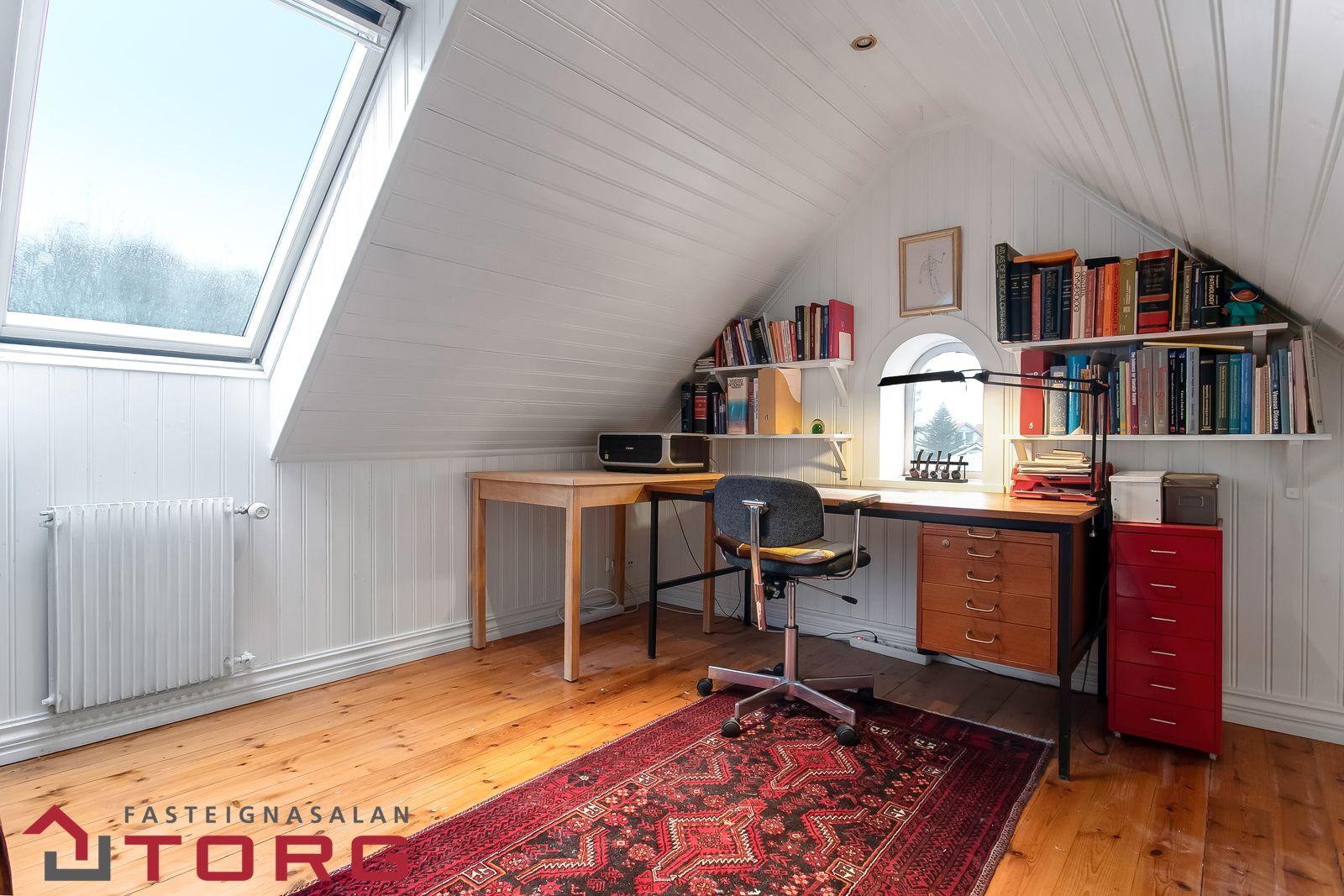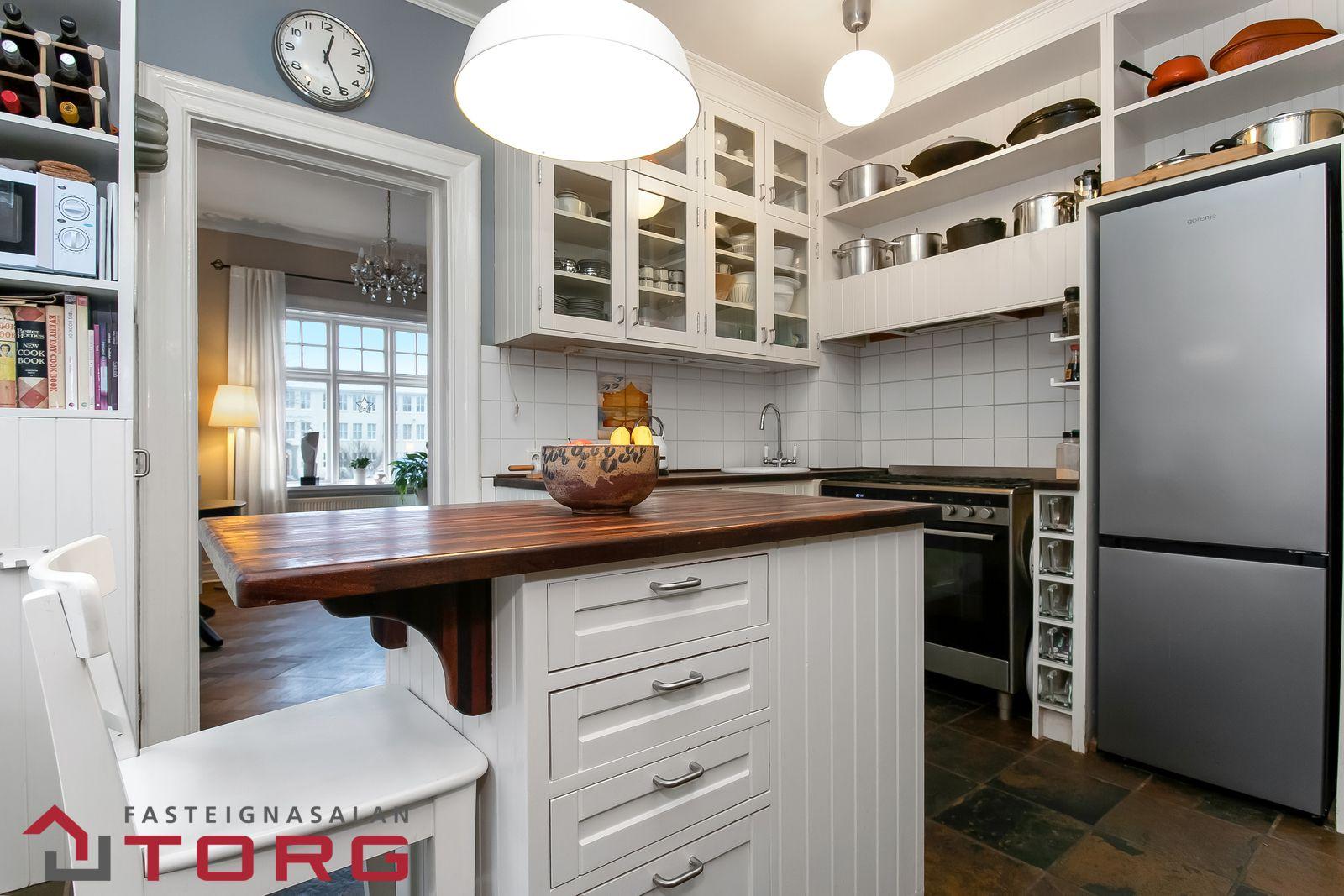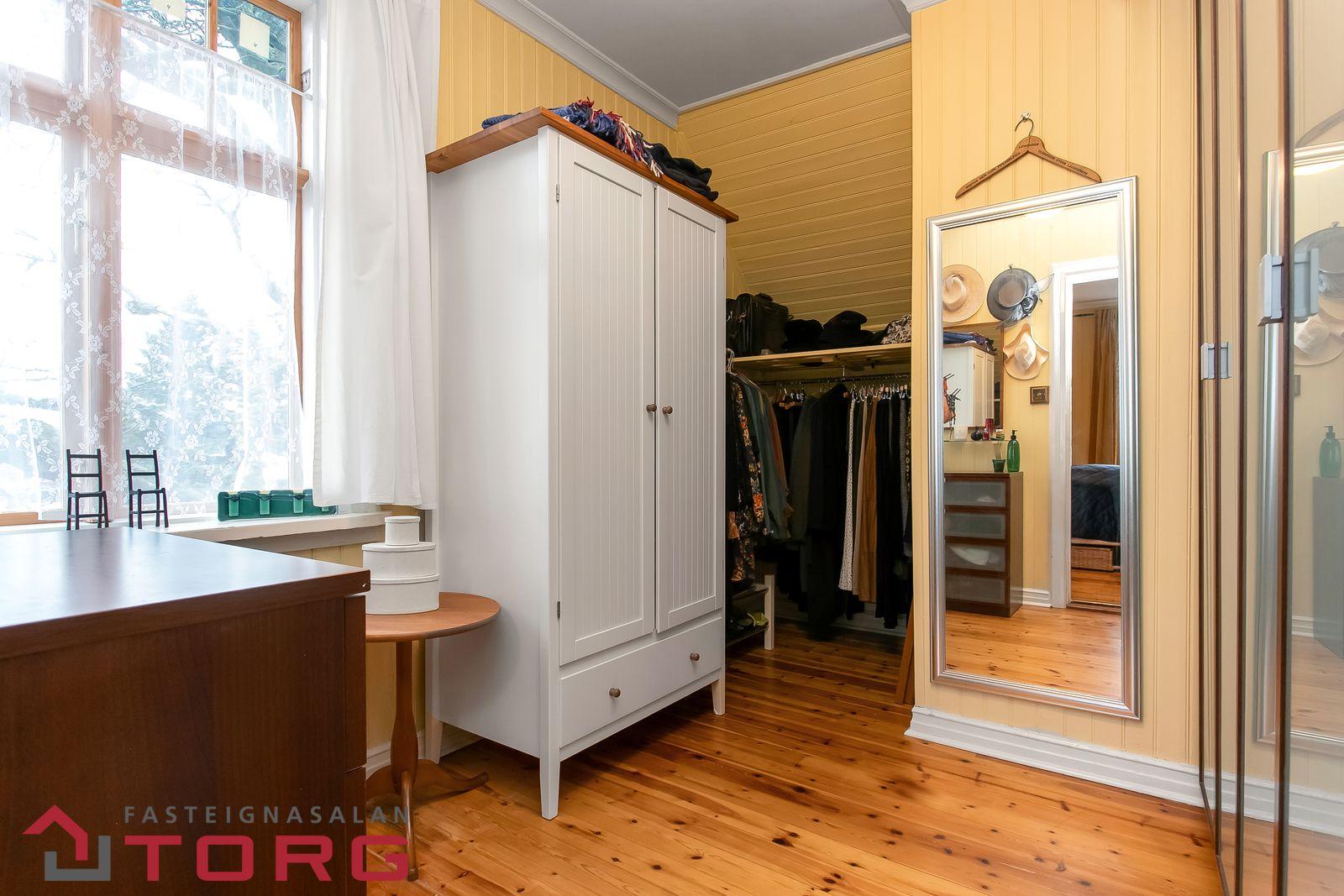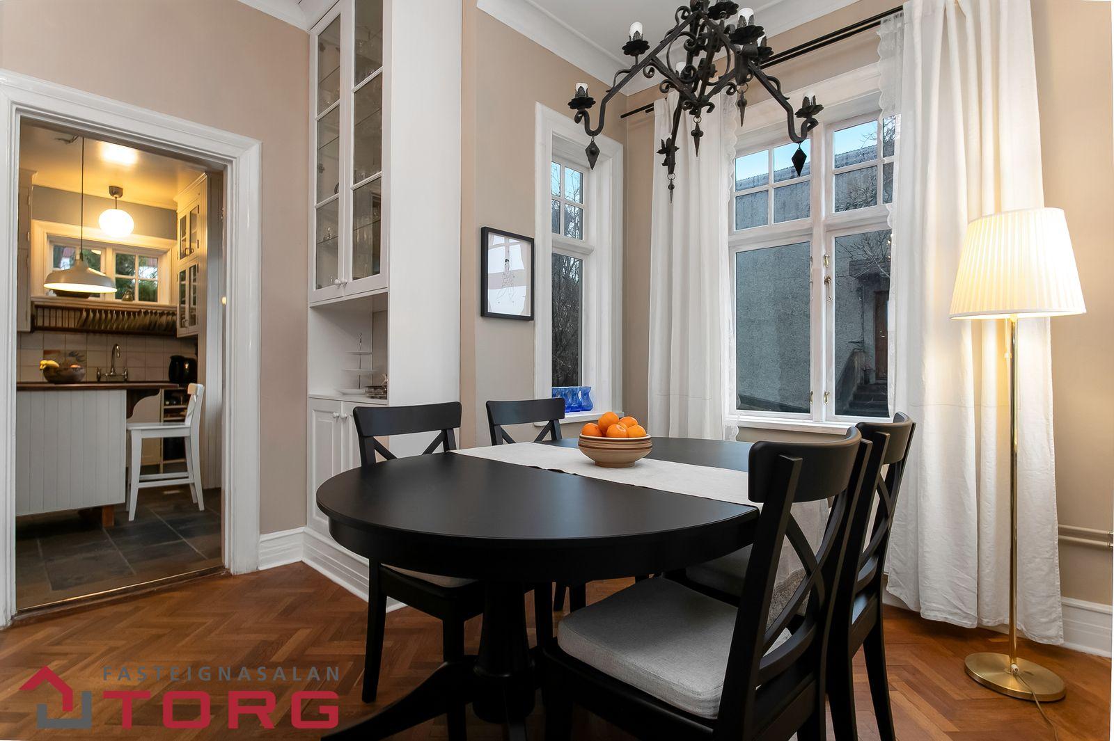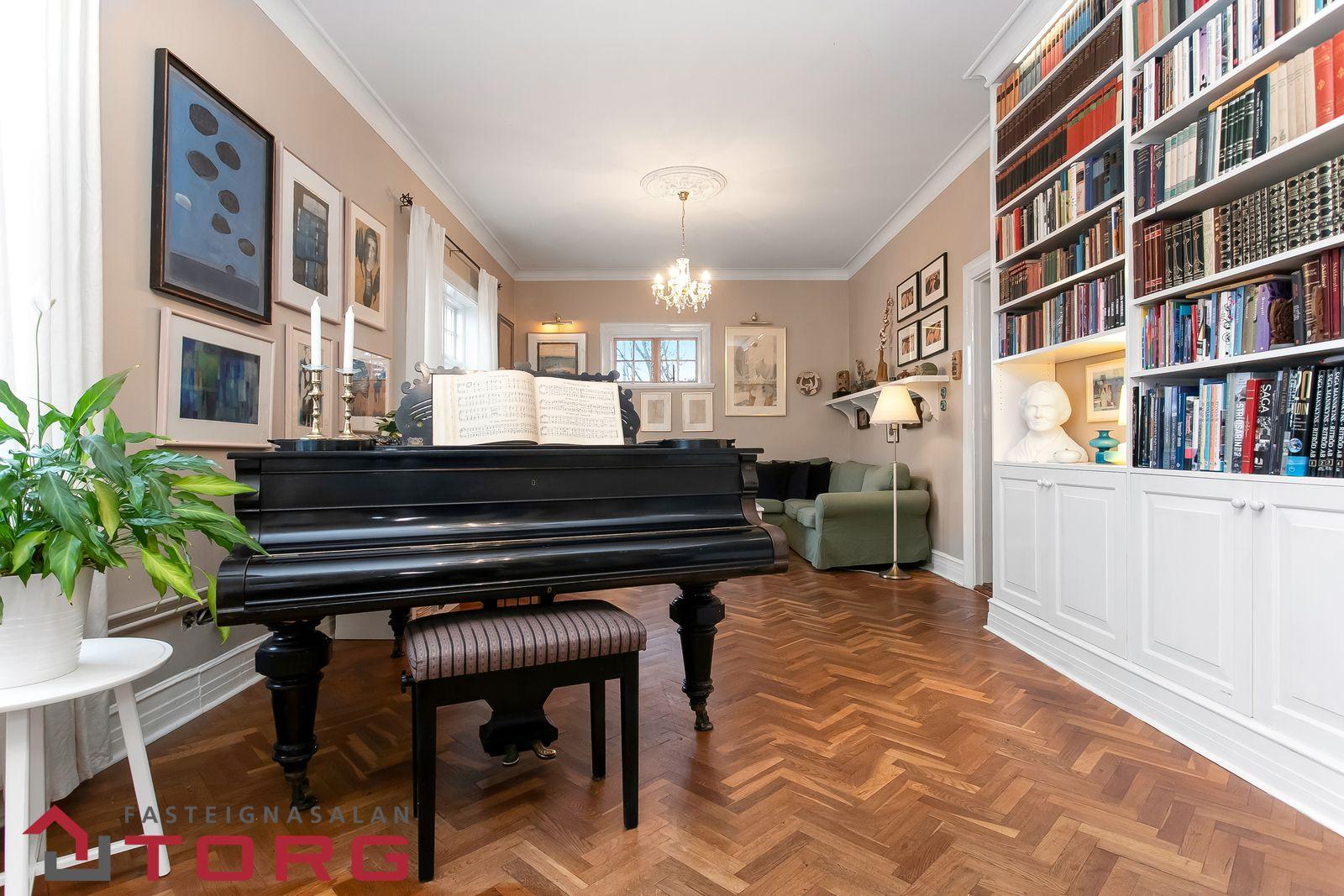 NÁNARI LÝSING : Mið hæð : komið er inn í flísalagða forstofu með fatahengi. Þaðan er komið inn í rúmgott hol með náttúruflísum á gólfi. Rúmgóð og björt stofa og borðstofa með fiskabeina parketi á gólfi. Mjög fallegir kverklistar og rósettur í loftum, fiskabeinaparketi á gólfum. Gluggar á þrjá vegu. Eldhúsið var endurnýjað fyrir um 20 árum síðan. Sér smíðuð innréttingu með miklu skápa plássi, flísar á milli skápa, mahogny borðplötur, stór gaseldavél, tengi fyrir uppþvottavél, náttúruflísar á gólfi. Opið er inn í borðstofu frá eldhúsi. Efri Hæð : Frá holi miðhæðar er rúmgóður stigi upp á efri hæðina. Komið er upp á gang með parketi á gólfi, við enda gangsins er útgengt út á litlar svalir sem snúa út að læknum. Rúmgott hjónaherbergi með fataherbergi innaf, parket á gólfi. Annað rúmgott herbergi með parketi á gólfi. Baðherbergi með sturtuklefa og fallegu standandi pottjárns baðkari, flísar á gólfi og veggjum. Gott þvottahús með dúk á gólfi. Innbyggðum geymsluskápur undir stiga. Efsta hæð : Frá holi miðhæðar er stigi upp á rishæðina. Komið er upp í rúmgott sjónvarpshol með gluggum á tvo vegu. Möguleiki á að útbúa gott svefnherbergi. Stórt svefnherbergi með parketi á gólfi. Annað minna herbergi með parketi á gólfi. Kjallari : Frá holi miðhæðar er steyptur stigi niður í kjallarann. Komið er í rúmgott hol með skápum. Mjög rúmgott herbergi/stofa með parketi á gólfi. Innaf því er annað rúmgott herbergi með parketi á gólfi. Baðherbergi með sturtuklefa, flísar á gólfi. Mjög rúmgóð geymsla er inn af holi. Annað : Búið er að skipta um alla glugga í húsinu fyrir utan 2 í risi. Einnig hafa frárennsislangir verðið endurnýjaðar og dren langir einnig. Skipt var um járn á þaki fyrir ca. 25 árum síðan.