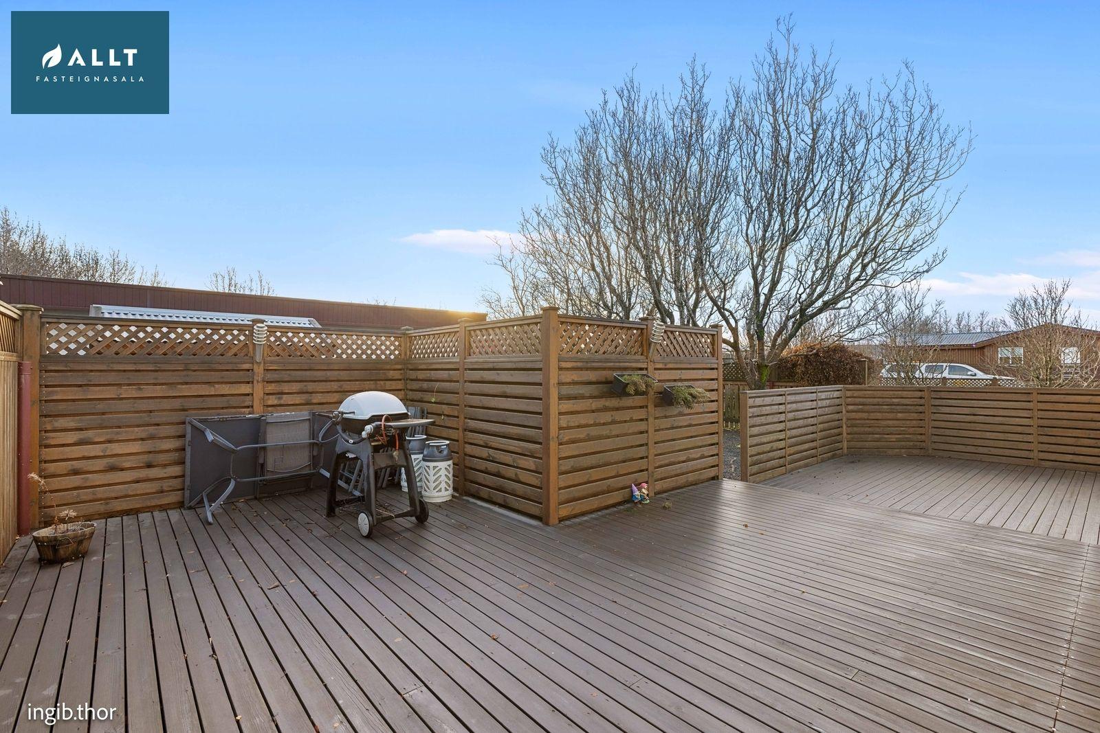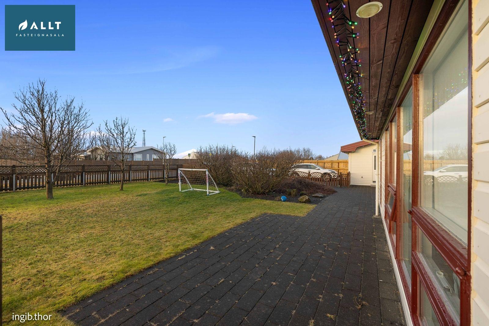 Lóð er afgirt að framanverðu og við sólpall. Grasbali framan og aftan við hús. Töluvert af trjám og gróðri er á lóð. Gönguleiðir og bílastæði hellulagt. Sólpallur með innangengi inn í borðstofu. 8 fm kofi á lóð.