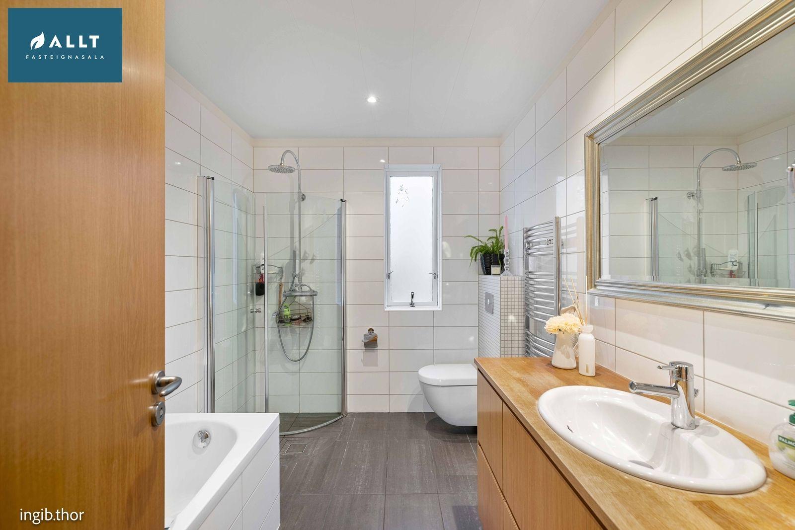 Baðherbergi: (endurnýjað 2009/10) .Flísalagt með upphengdu salerni, eikar-innréttingu, sturtu, baðkari og handklæðaofn.