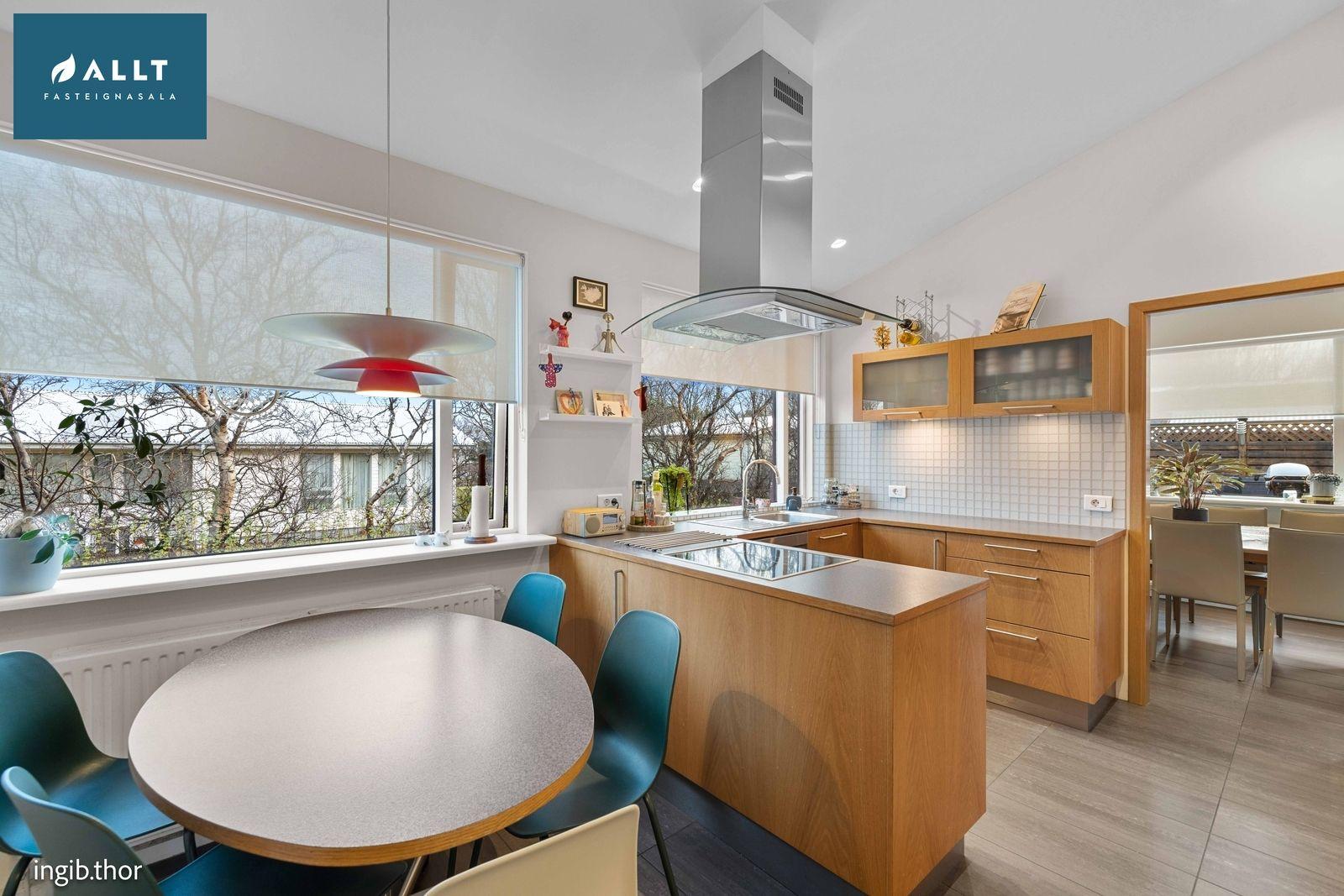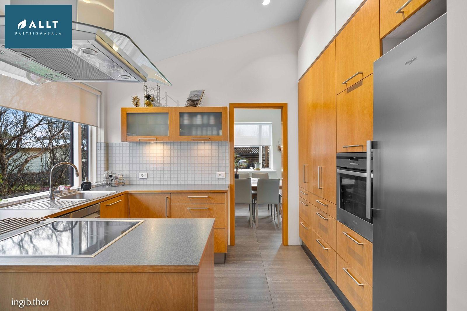 Með eikarinnréttingum, bjart rými. Innangengt í þvottahús og í borðstofu. Gólf flísalagt.