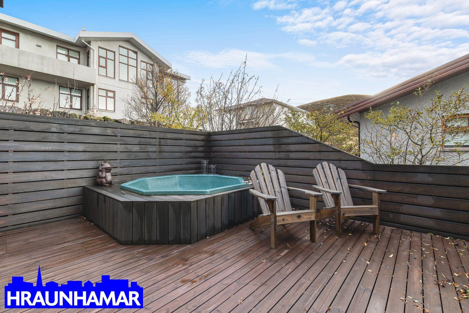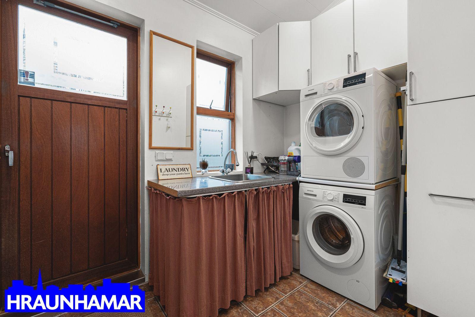 bakgarðinn frá hjónaherbergi. Gott þvottaherbergi með skáp og skolvaski, útgeng út í bakgarðinn. Pallur með