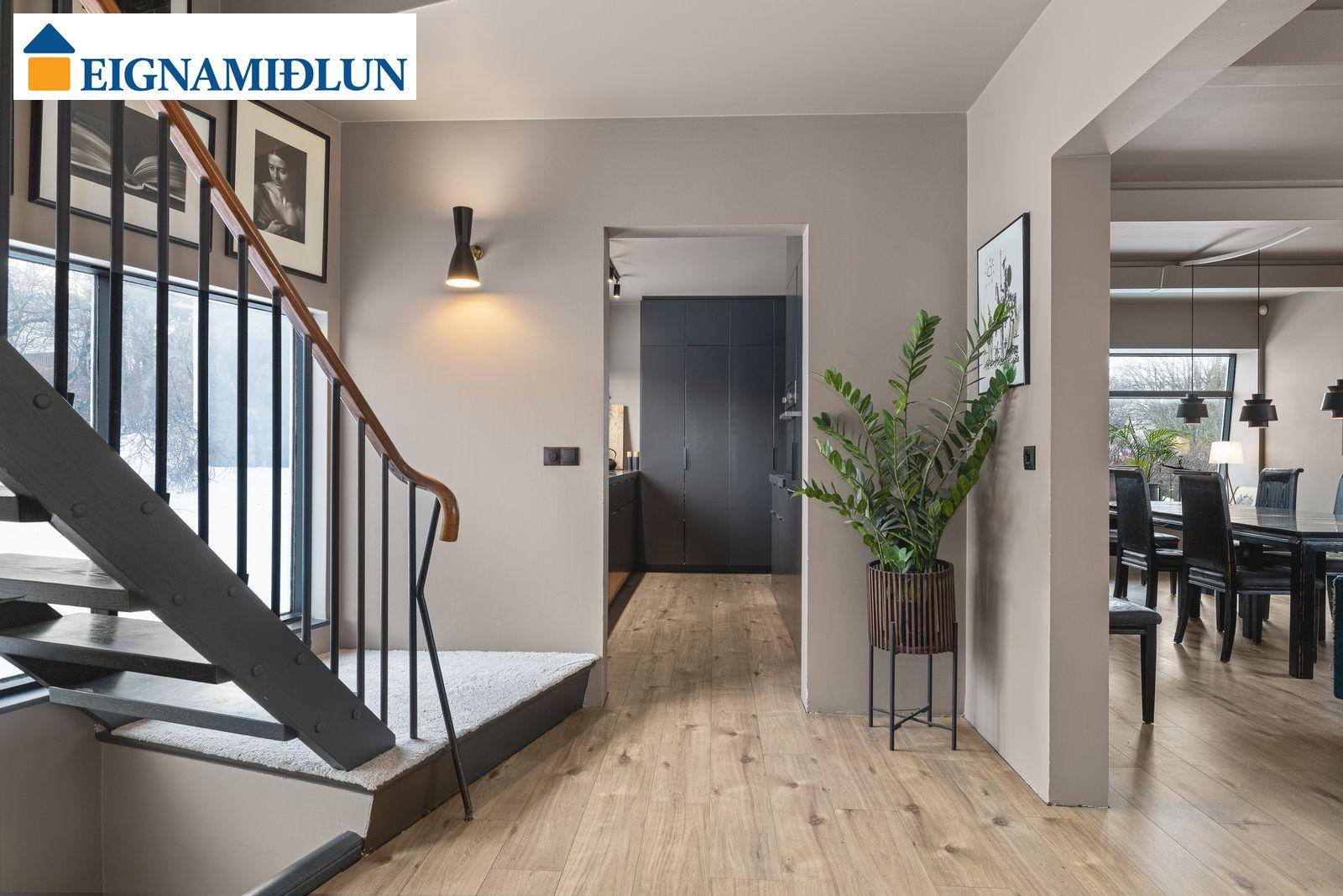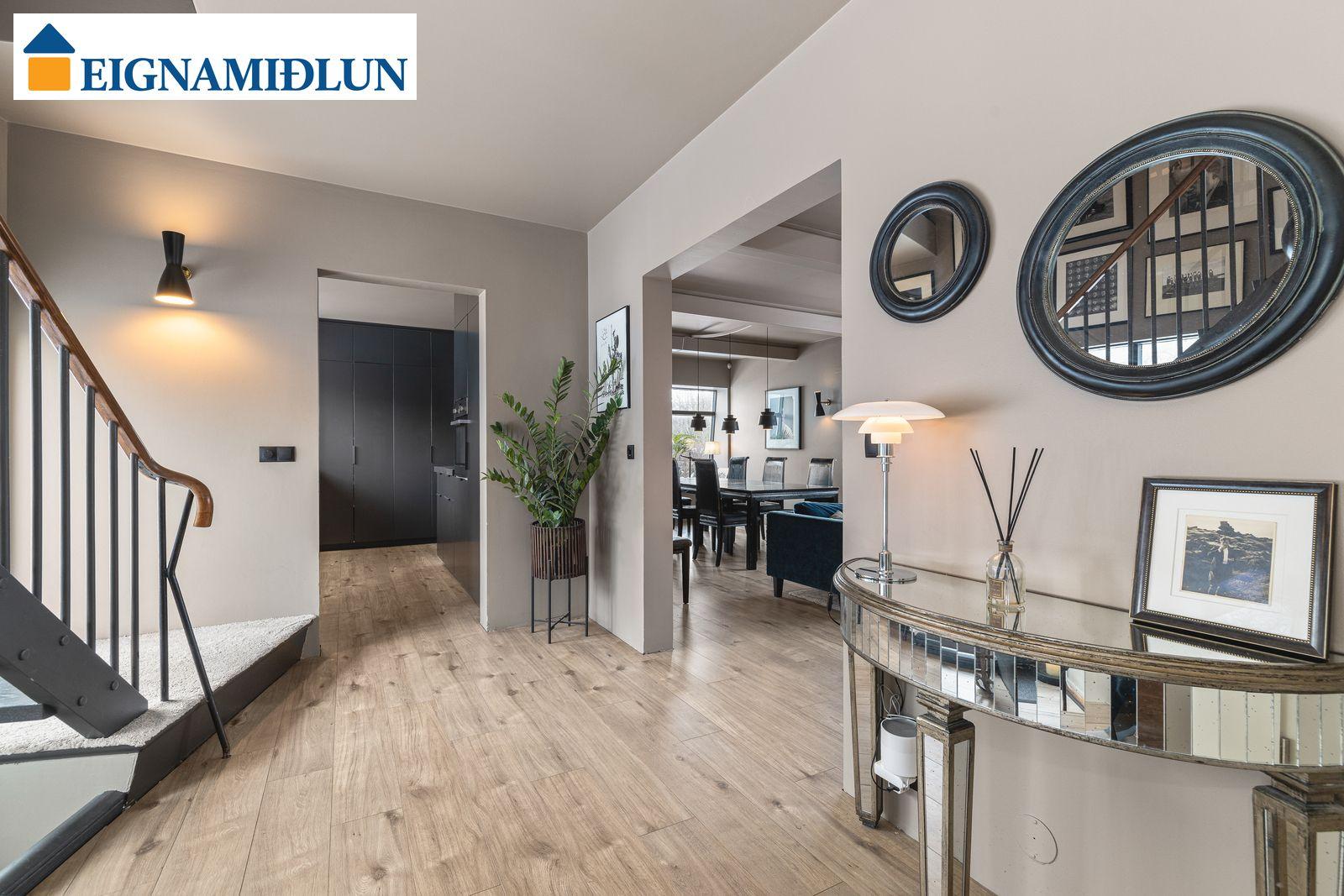 AÐALHÆÐ: Forstofa, hol, gestasnyrting, rúmgóðar stofur og eldhús.