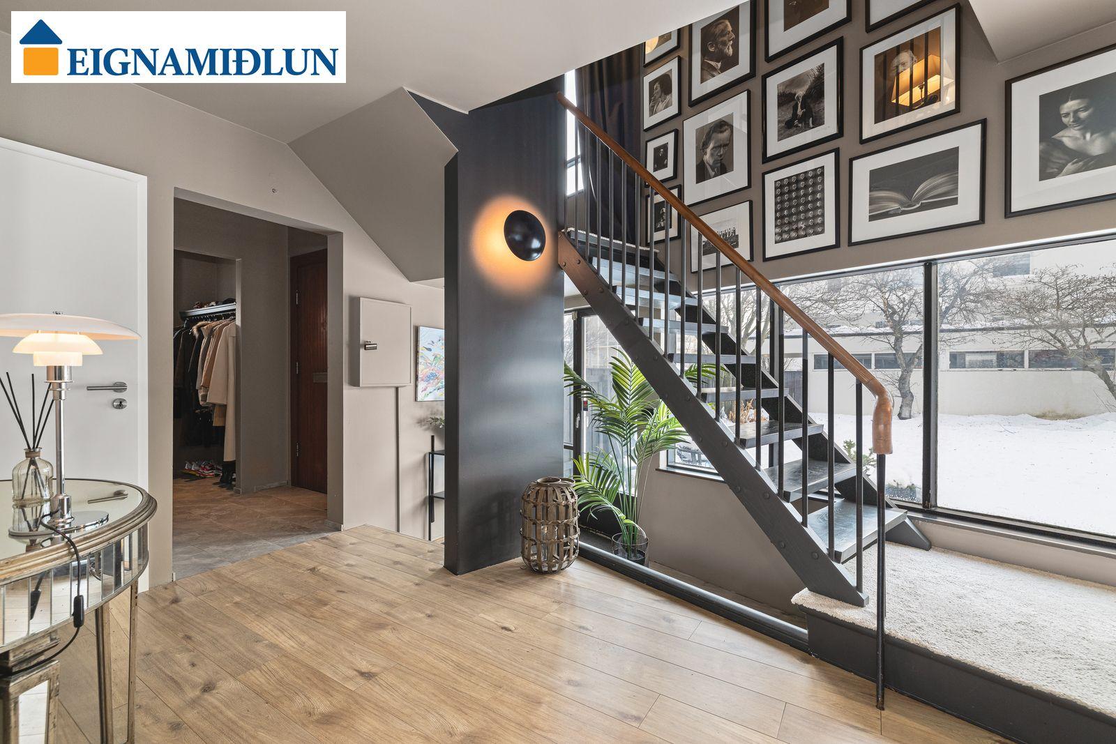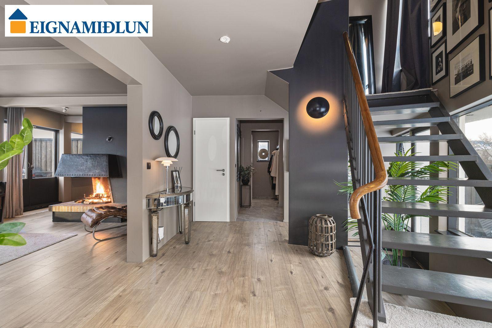 201-9640, nánar tiltekið eign merkt 01-01. Ibúðarrýmið er skráð 208,1 fm og bílskúrinn er skráður 32,0 fm, birt heildarstærð 240.1 fm. Svalir eru tvennar af aðalhæð og út frá svefnherbergi efri hæðar.