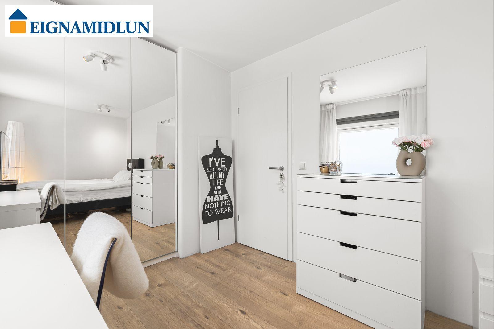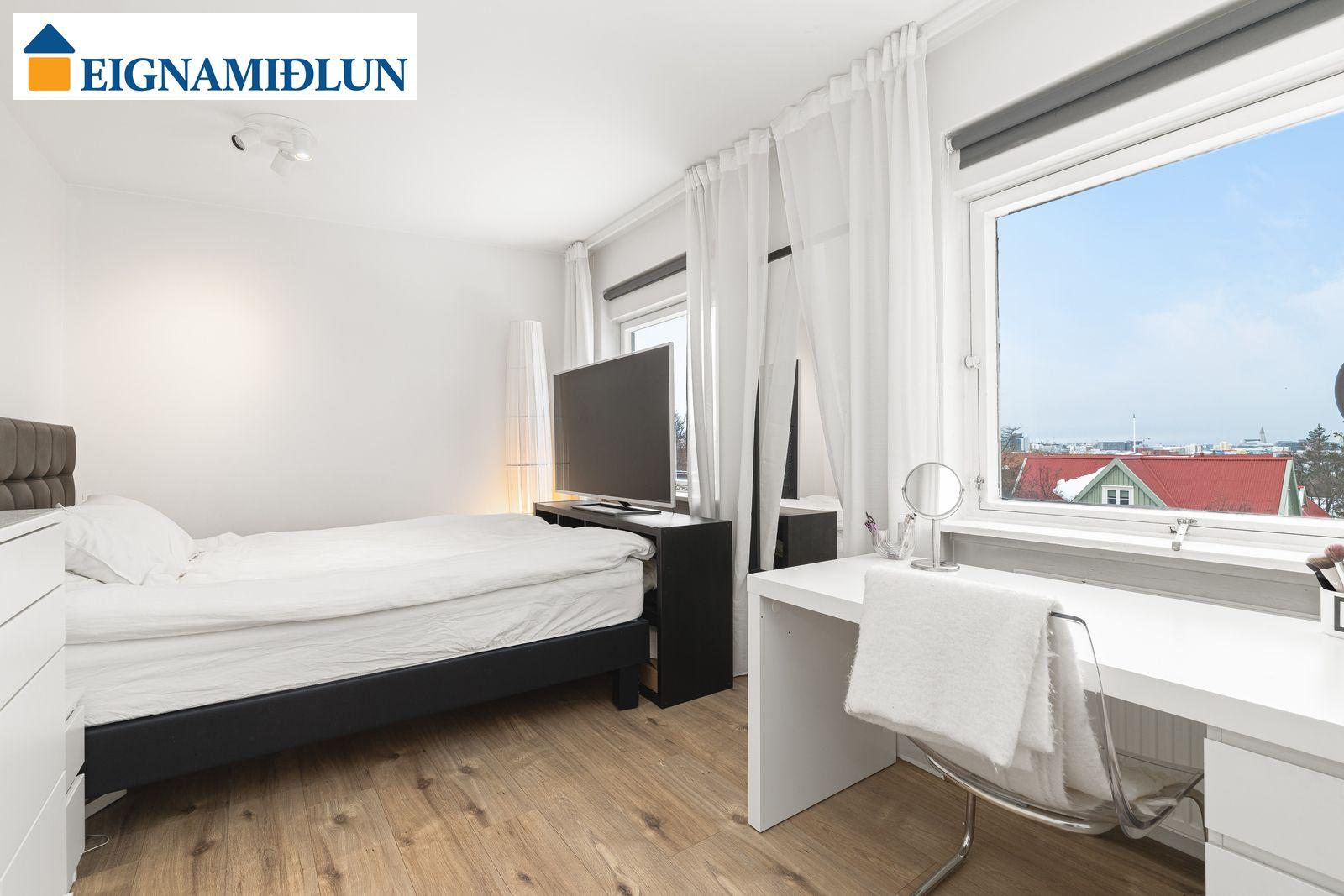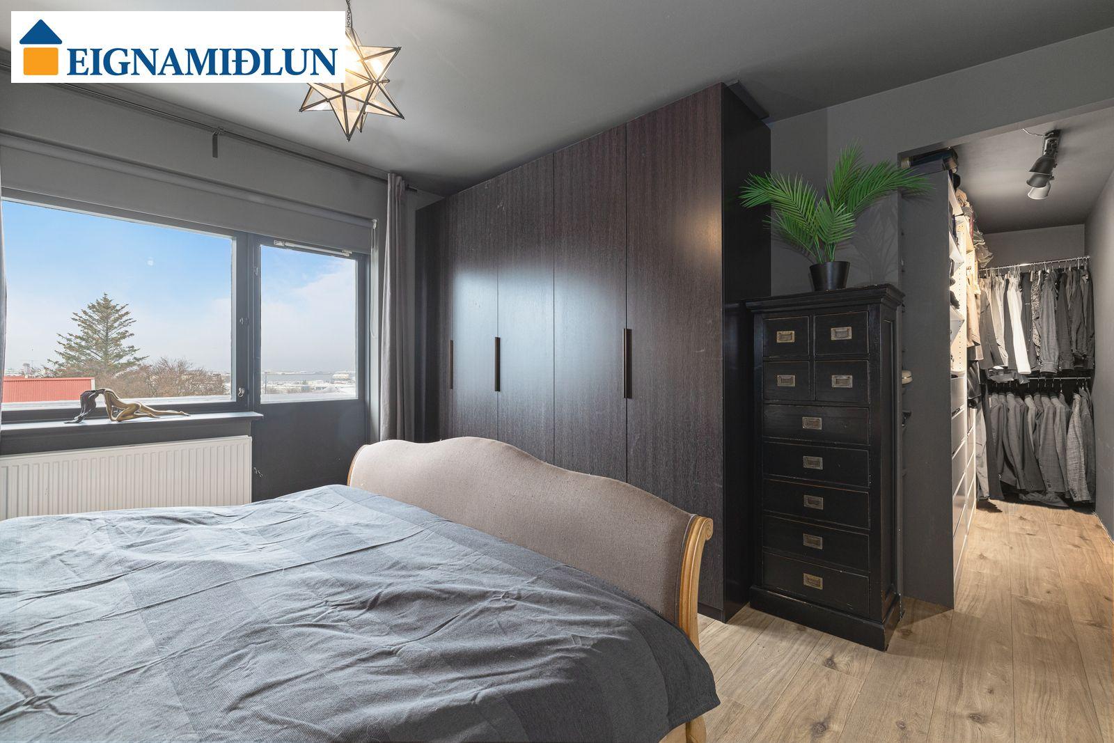 EFRI HÆÐ: HERBERGI I: Skrifstofa eða svefnherbergi með hillum og harðparketi. HERBERGI II: Rúmgott herbergi með skápum, harðparket. HERBERGI III: Stórt herbergi sem samkvæmt teikningu var áður tvö en búið að sameina. HERBERGI IIII: Hjónaherbergi með góðum skápum og "fataherbergi" harðparket. Gengið úr svefnherberginu út á vestursvalir með glæsilegu útsýni. BAÐHERBERGI: Var endurnýjað fyrir þó nokkrum árum, sturtuklefi og nuddbaðkar, flísar á gólfi LÍNHERBERGI: