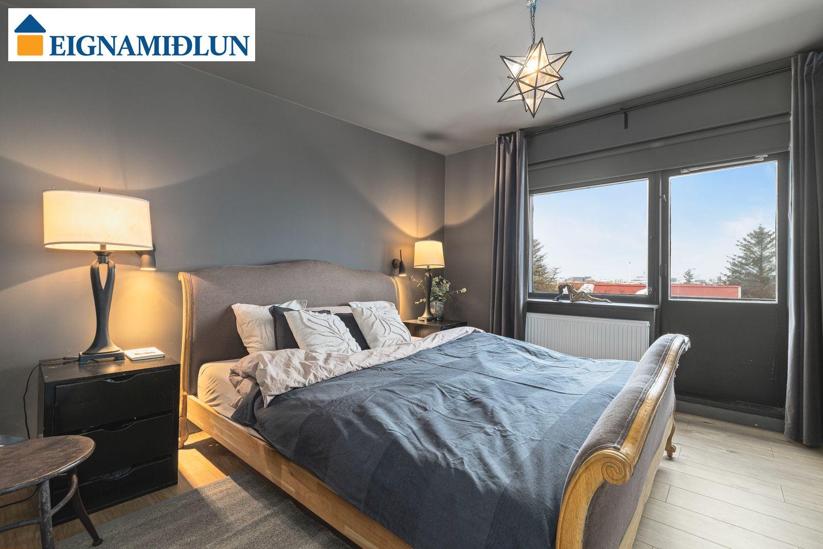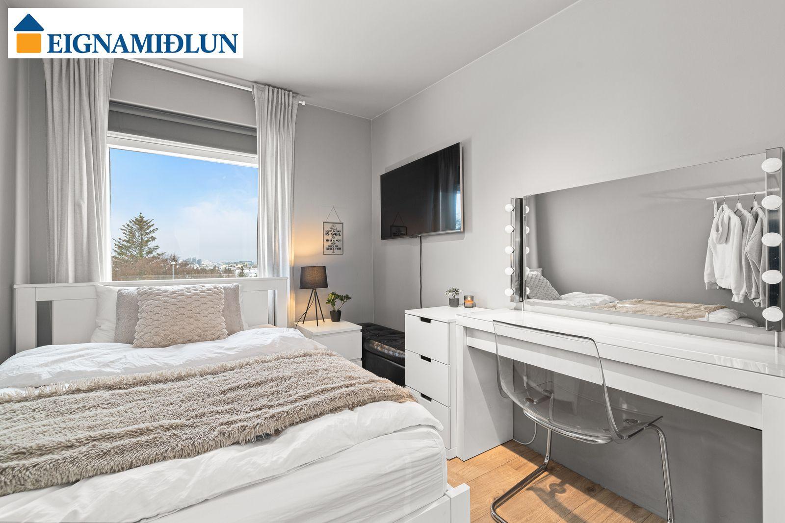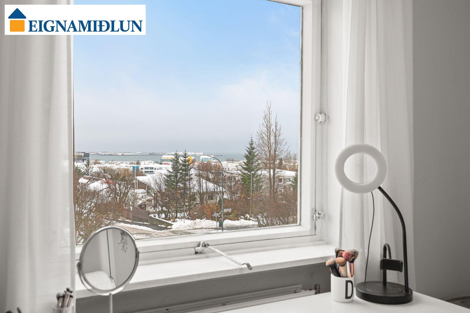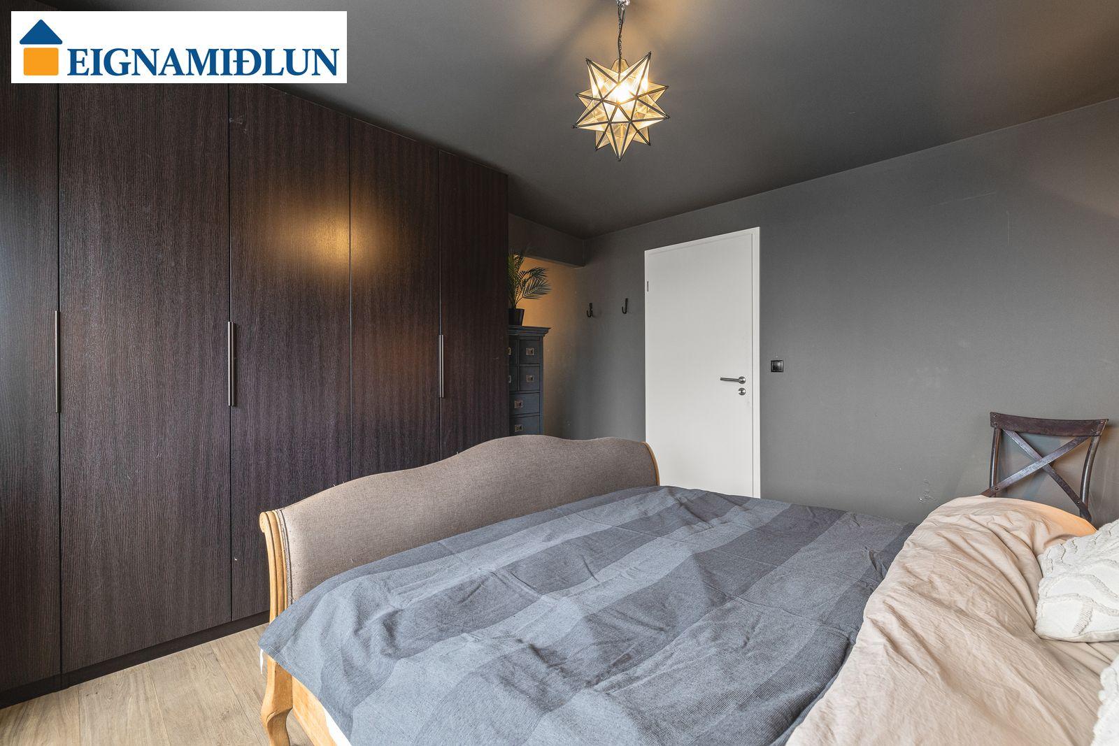 EFRI HÆÐ: HERBERGI I: Skrifstofa eða svefnherbergi með hillum og harðparketi. HERBERGI II: Rúmgott herbergi með skápum, harðparket. HERBERGI III: Stórt herbergi sem samkvæmt teikningu var áður tvö en búið að sameina. HERBERGI IIII: Hjónaherbergi með góðum skápum og "fataherbergi" harðparket. Gengið úr svefnherberginu út á vestursvalir með glæsilegu útsýni. BAÐHERBERGI: Var endurnýjað fyrir þó nokkrum árum, sturtuklefi og nuddbaðkar, flísar á gólfi LÍNHERBERGI: