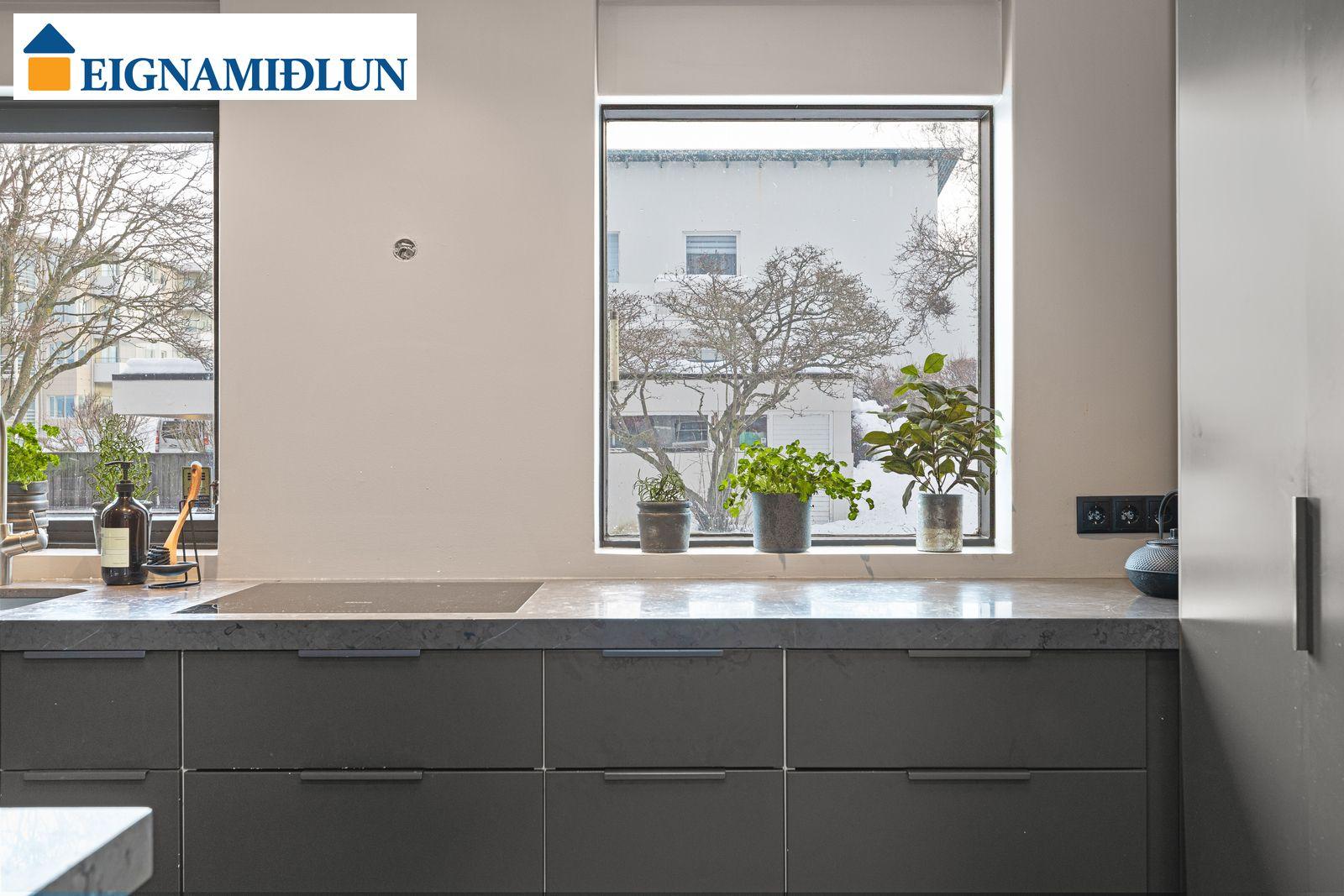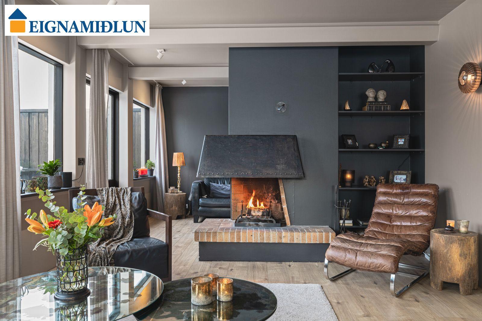 MIÐHÆÐ: FORSTOFA: Flísalögð. GESTASNYRTING: Endurnýjuð flísalögð og ný hreinlætistæki. HOL: Með harðparketi. ELDHÚS: Eldhúsið er nýlega endurnýjað með sprautulakkaðri innréttingu,harðparket, innfelld tæki bæði ísskápur og uppþvottavél. Steinn á borðum. STOFUR: Rúmgóðar stofur með harðparketi. Flottur arinn sem svínvirkar í stofu, innri stofa eða sjónvarpsherbergi. Gengið út á góðar útsýnissvalir til vesturs með mjög góðu útsýni og þaðan niður í garð.