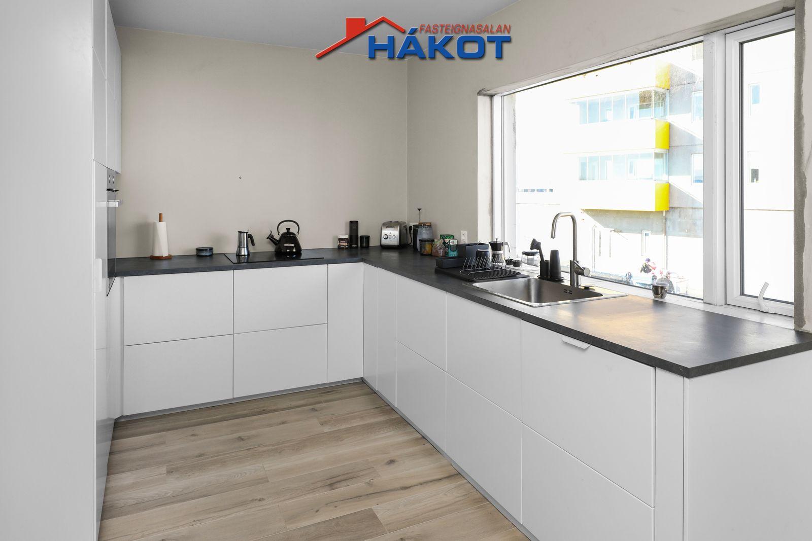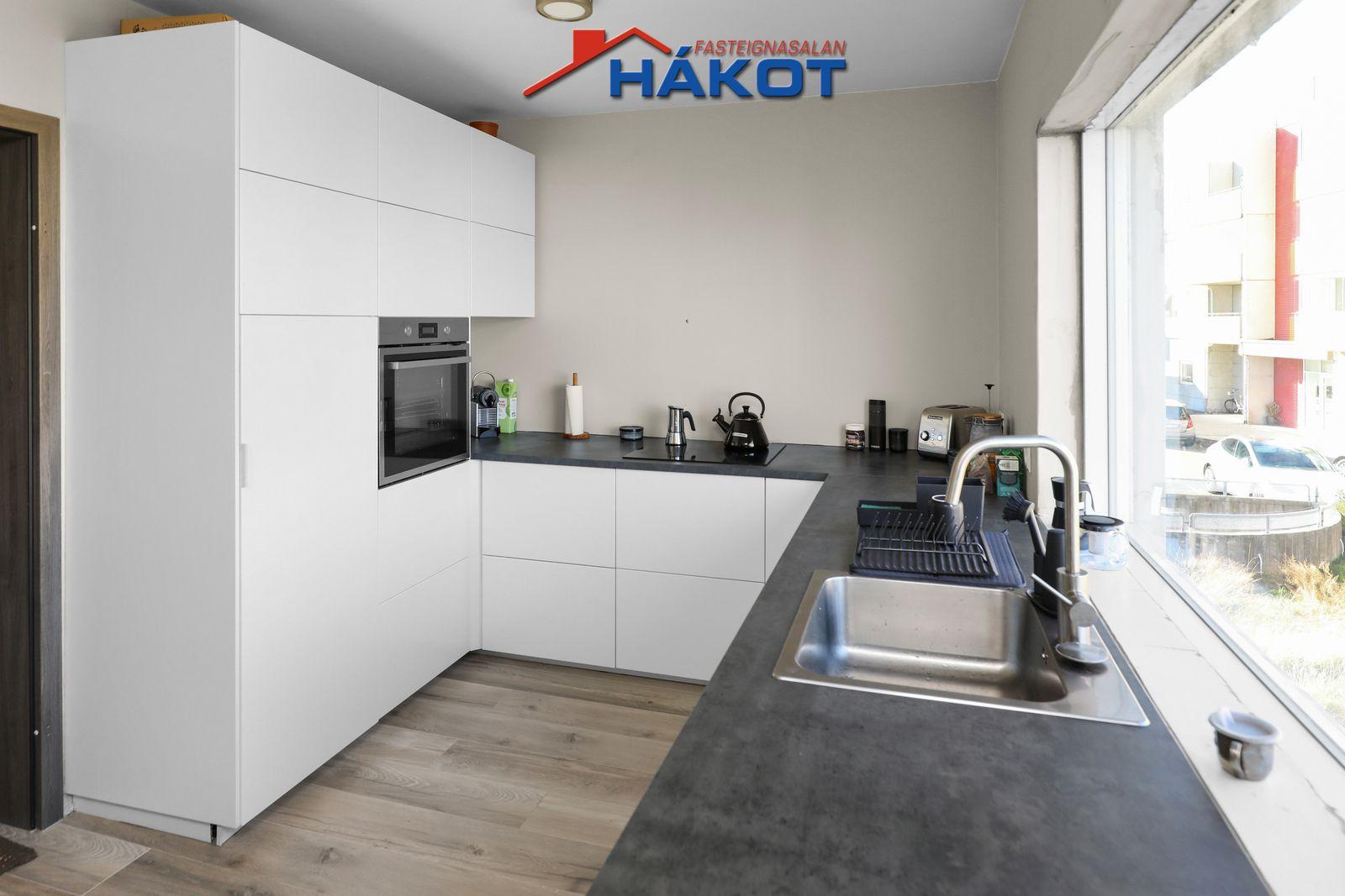 Eldhús (parket, hvít innrétting, ofn, helluborð, innbyggð uppþvottavél og ísskápur).