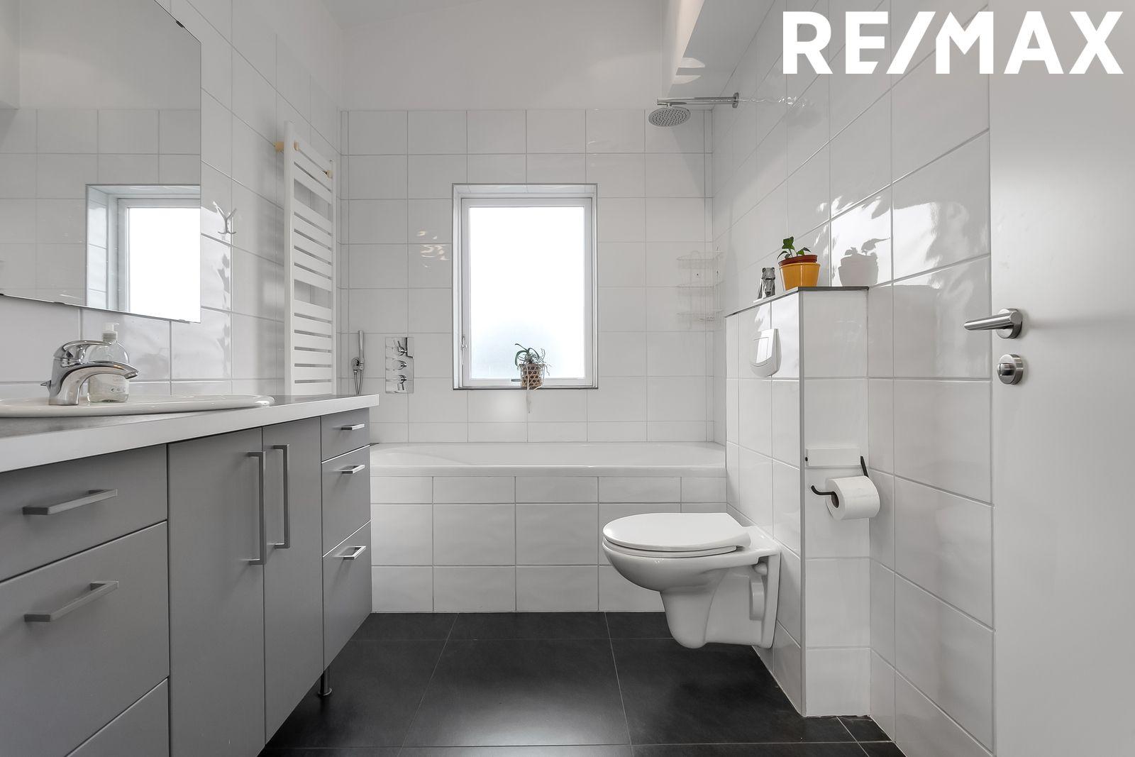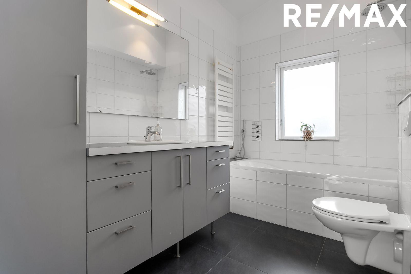 Baðherbergi: Flísar á gólfi og veggjum. Falleg baðinnrétting, baðkar með sturtu, innbyggð blöndunartæki. Handklæðaofn og upphengt salerni. Gluggi í rýminu.