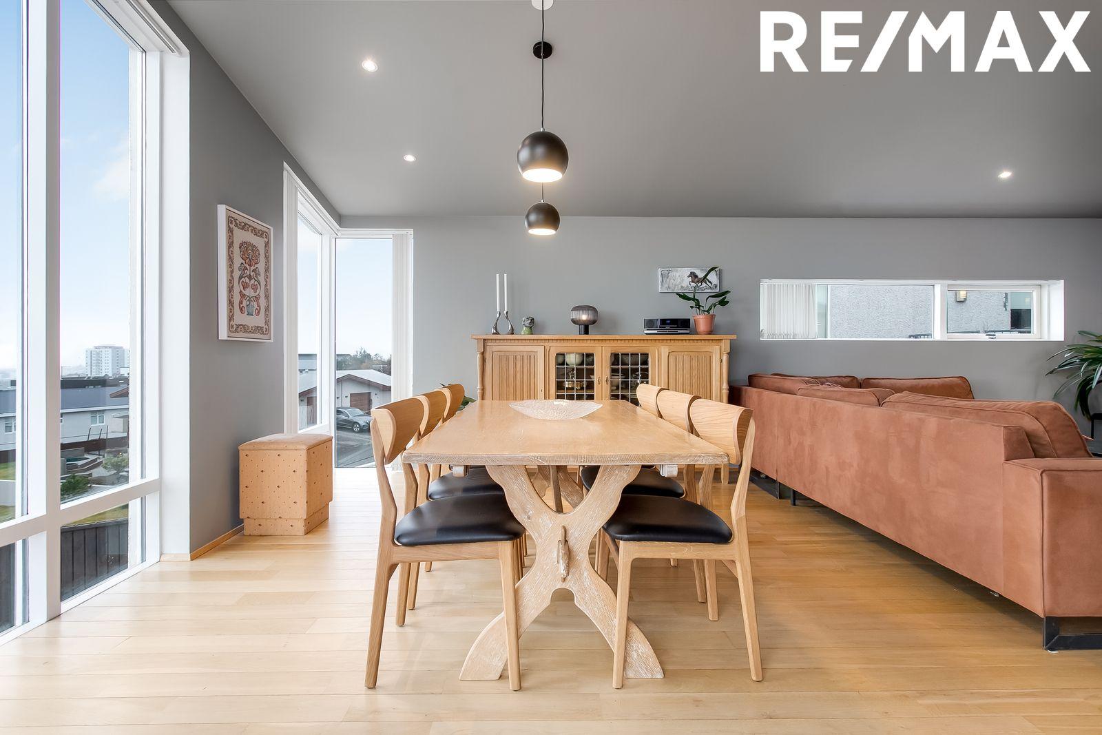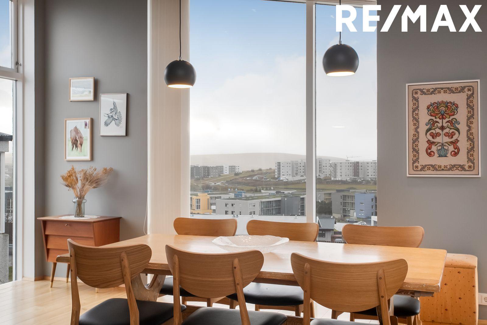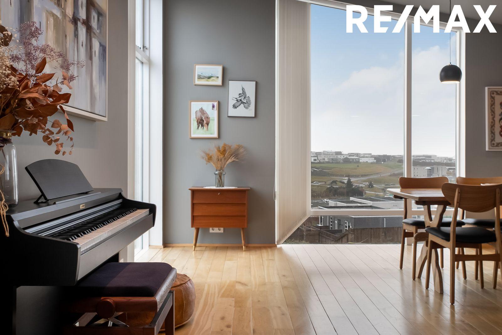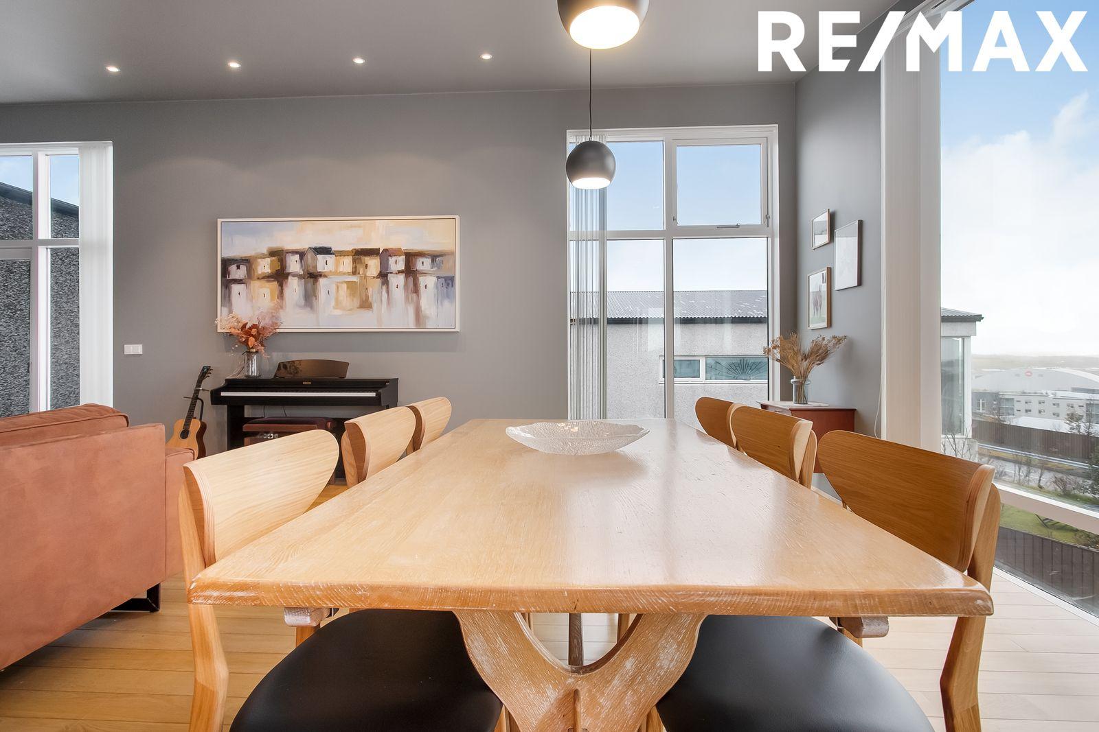Stofa/borðstofa: Parket á gólfi. Bjart og fallegt rými með aukinni lofthæð og gólfsíðum gluggum. Fallegt útsýni frá rýminu. Útgengt út á 15,2 fm svalir frá rýminu.