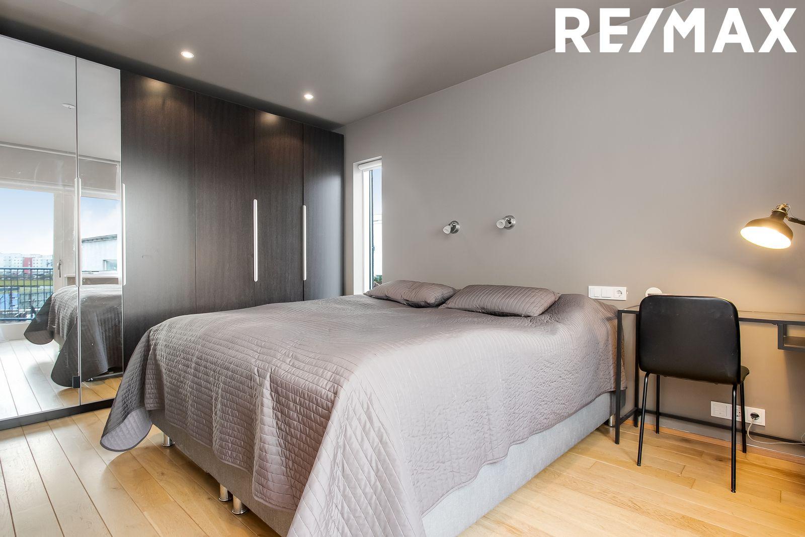 Hjónaherbergi: Parket á gólfi og fataskápur.