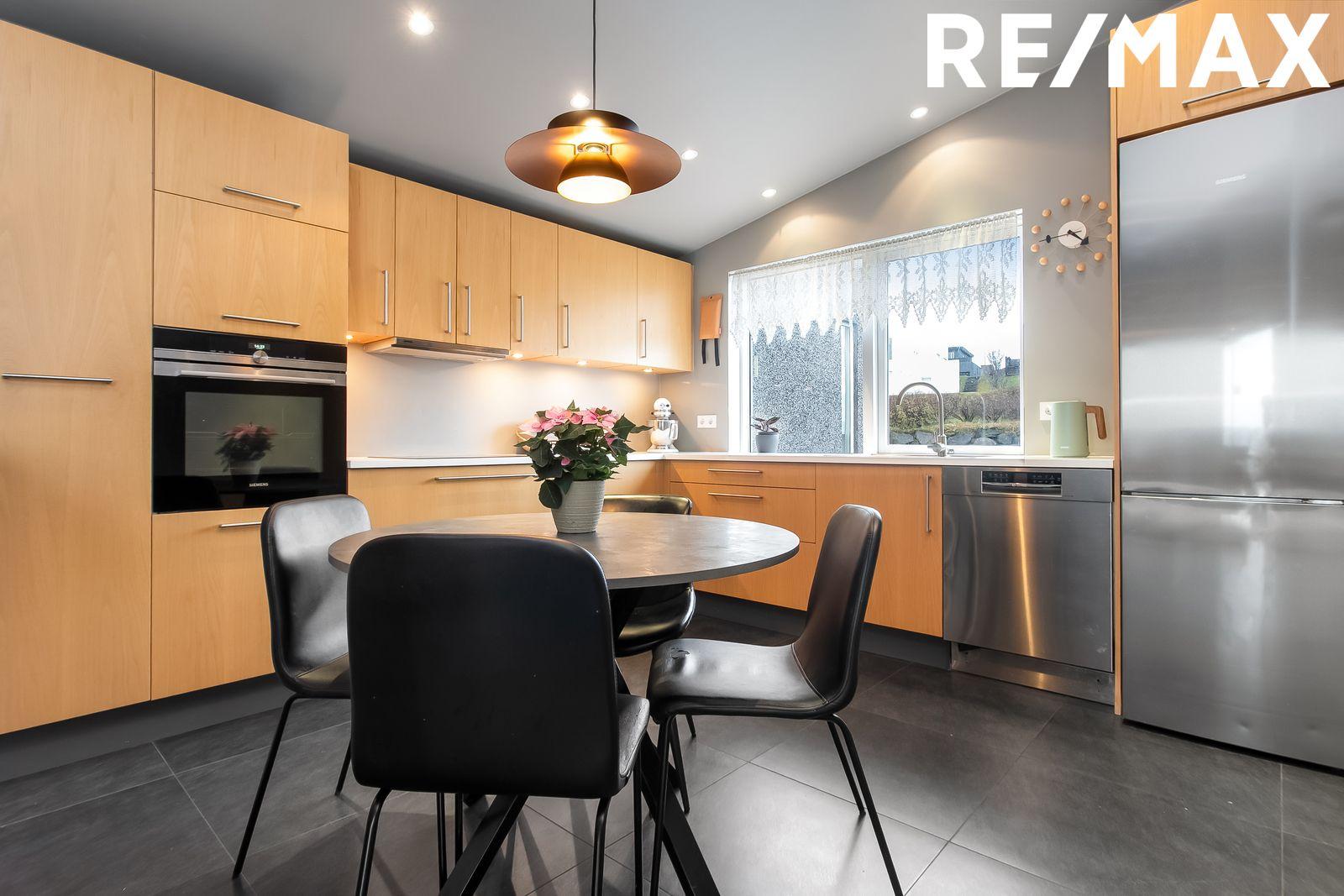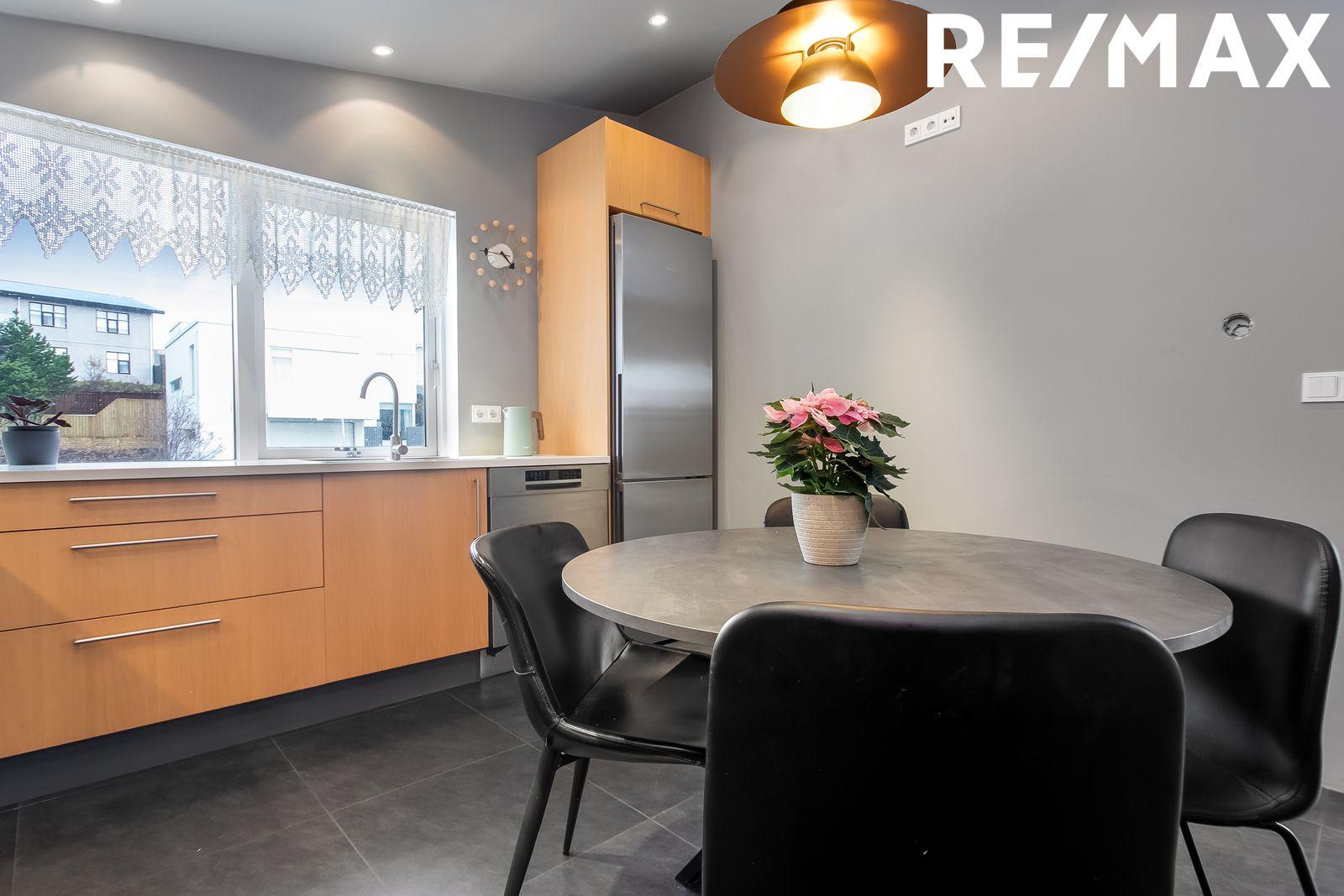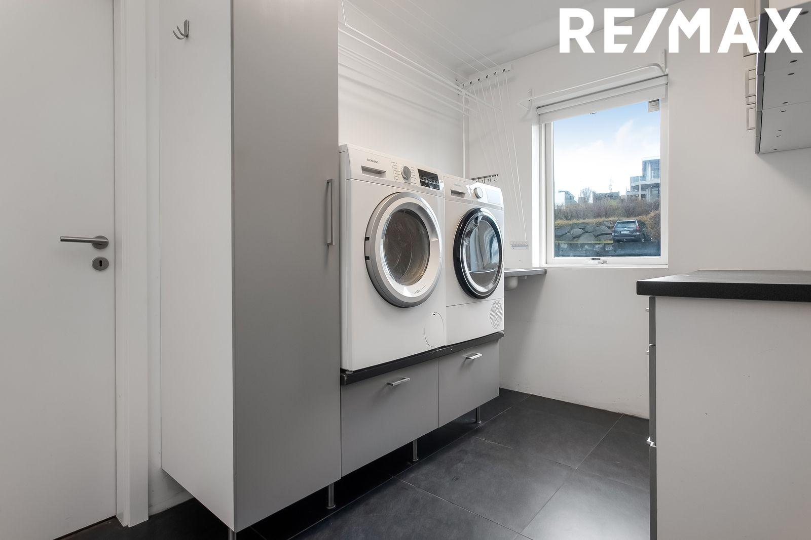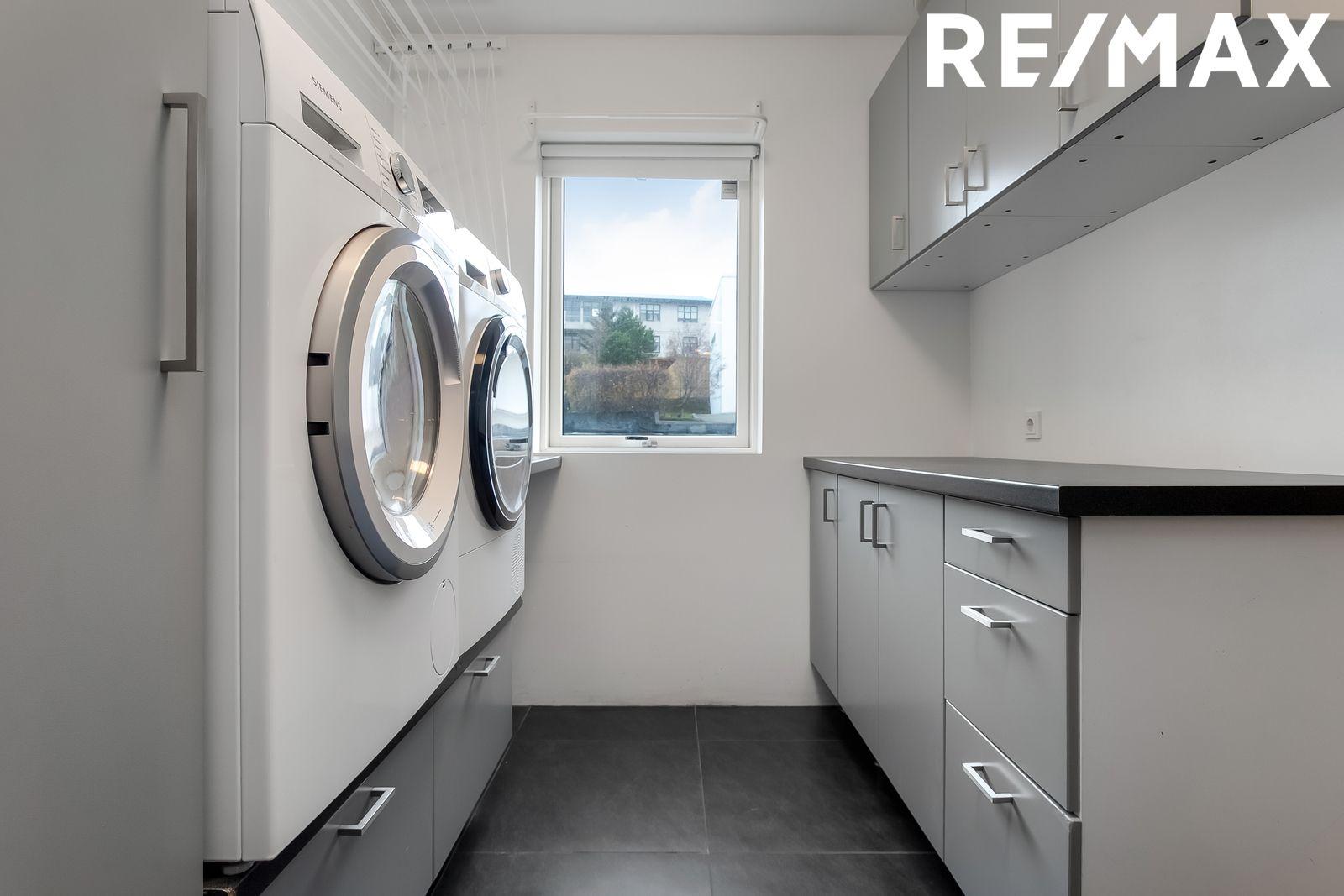 Þvottahús: Flísar á gólfi. Góð innrétting með vinnuborði og efri skápum. Innrétting undir þvottavél og þurrkara. Gluggi í rýminu.