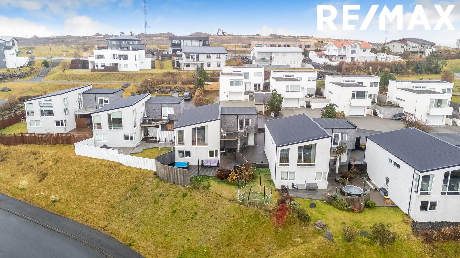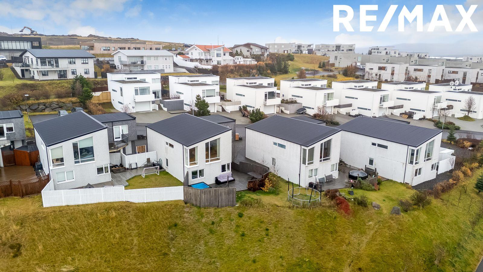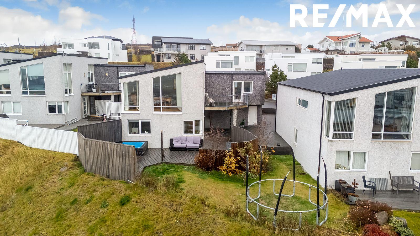 Lóð: Rúmgóð hellulögð innkeyrsla með snjóbræðslu. Á baklóð hússins er timburverönd með skjólveggjum og heitum potti.
