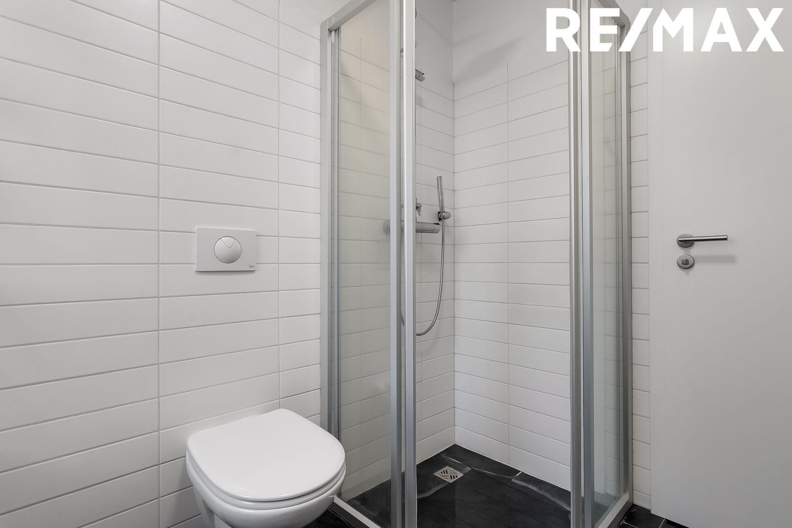 Baðherbergi: Flísar á gólfi og veggjum. Hvít baðinnrétting, upphengt salerni og sturtuklefi. Gluggi í rýminu.