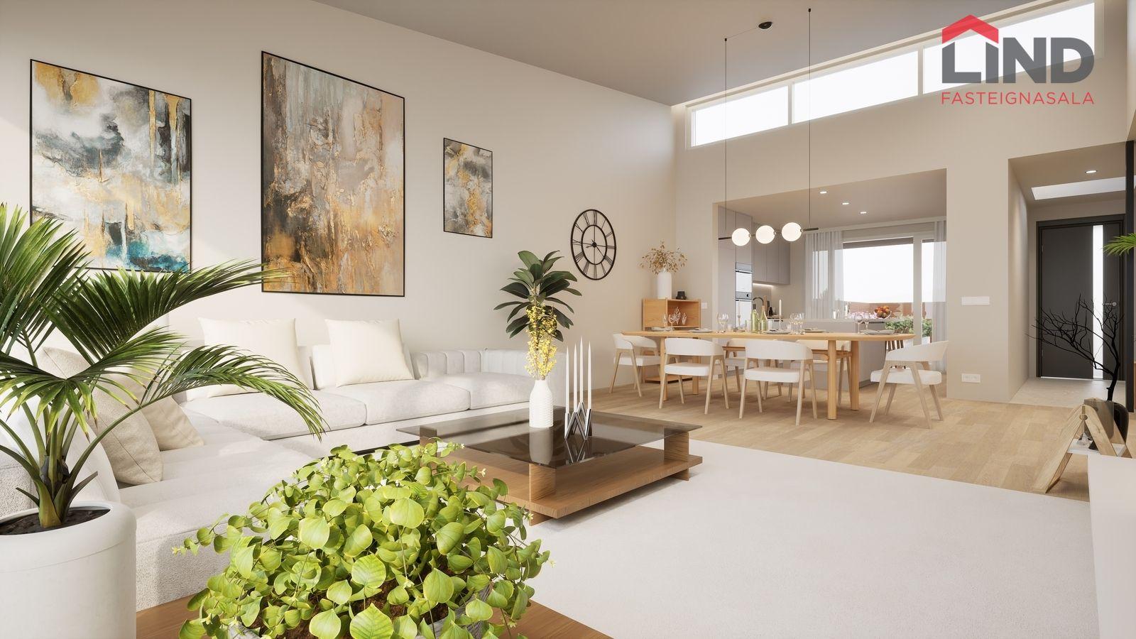 Borðstofa/stofa: Rúmgott og bjart alrými. Stórir gluggar sem gefa fallega birtu inní rýmið, hátt til lofts. Loftadúkur með innfeldri lýsingu. Auka lagnaleiðir voru lagðar að öllum gluggum, svo auðvelt sé að snjallvæða húsið.