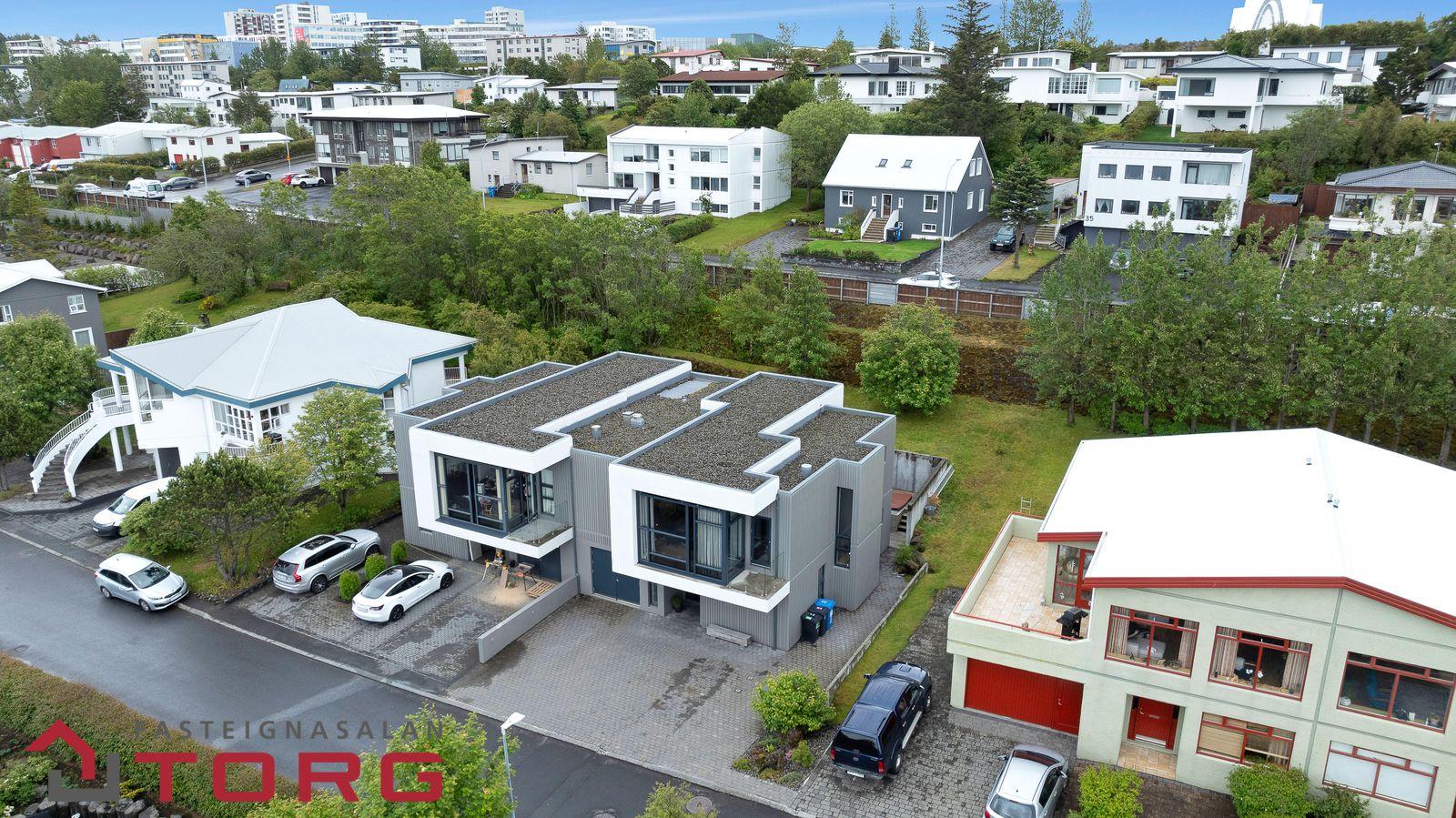 Garður og aðkoma: aðkoman er falleg, hellulagt bílaplan með hitaílögnum, steyptir veggir með lýsingu, verönd úr harðvið og heitur pottur. Í garðinum er svokallað úthagatorf í stað hefðbundins grass, krefst mjög lítillar umhirðu.