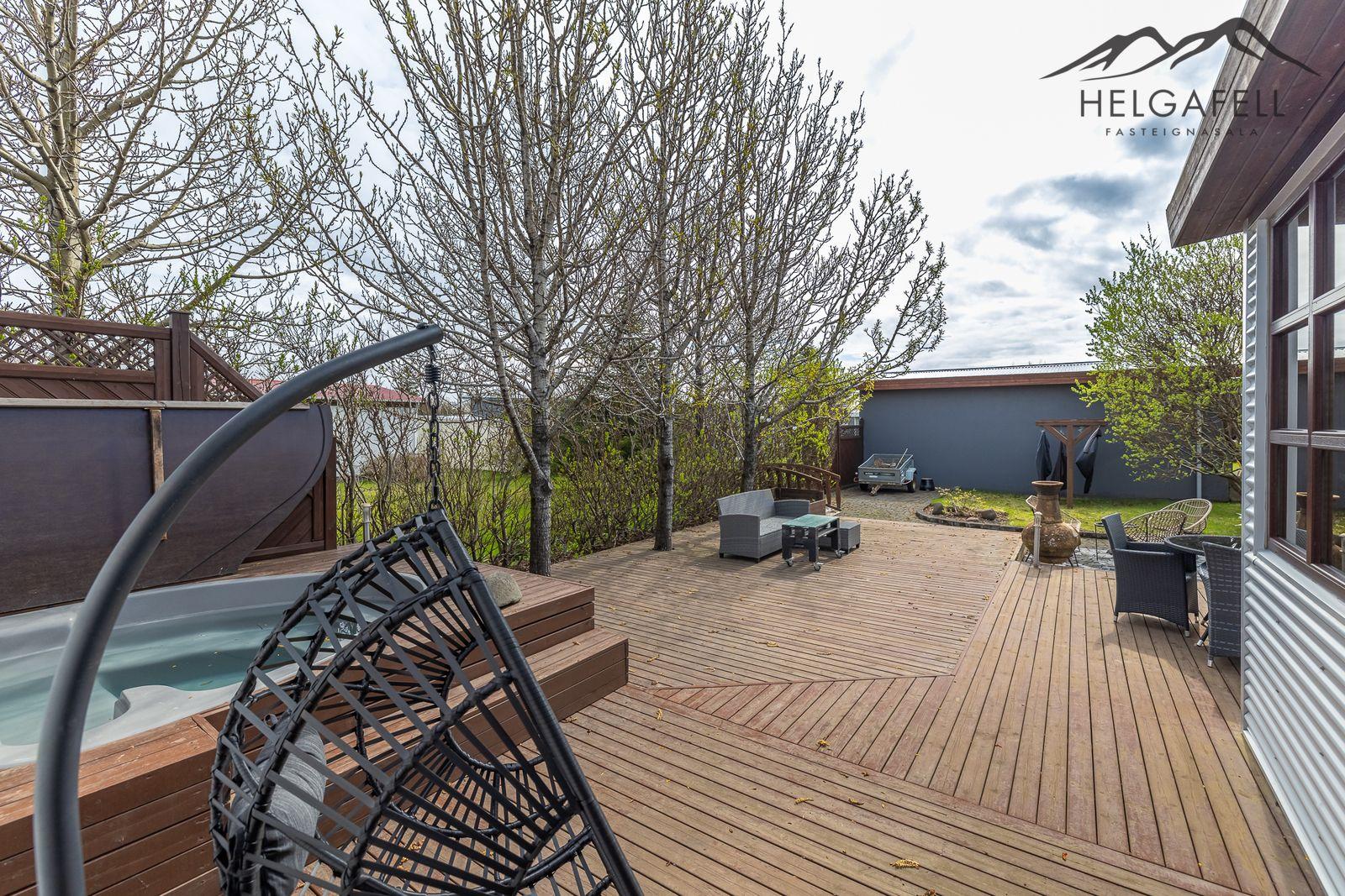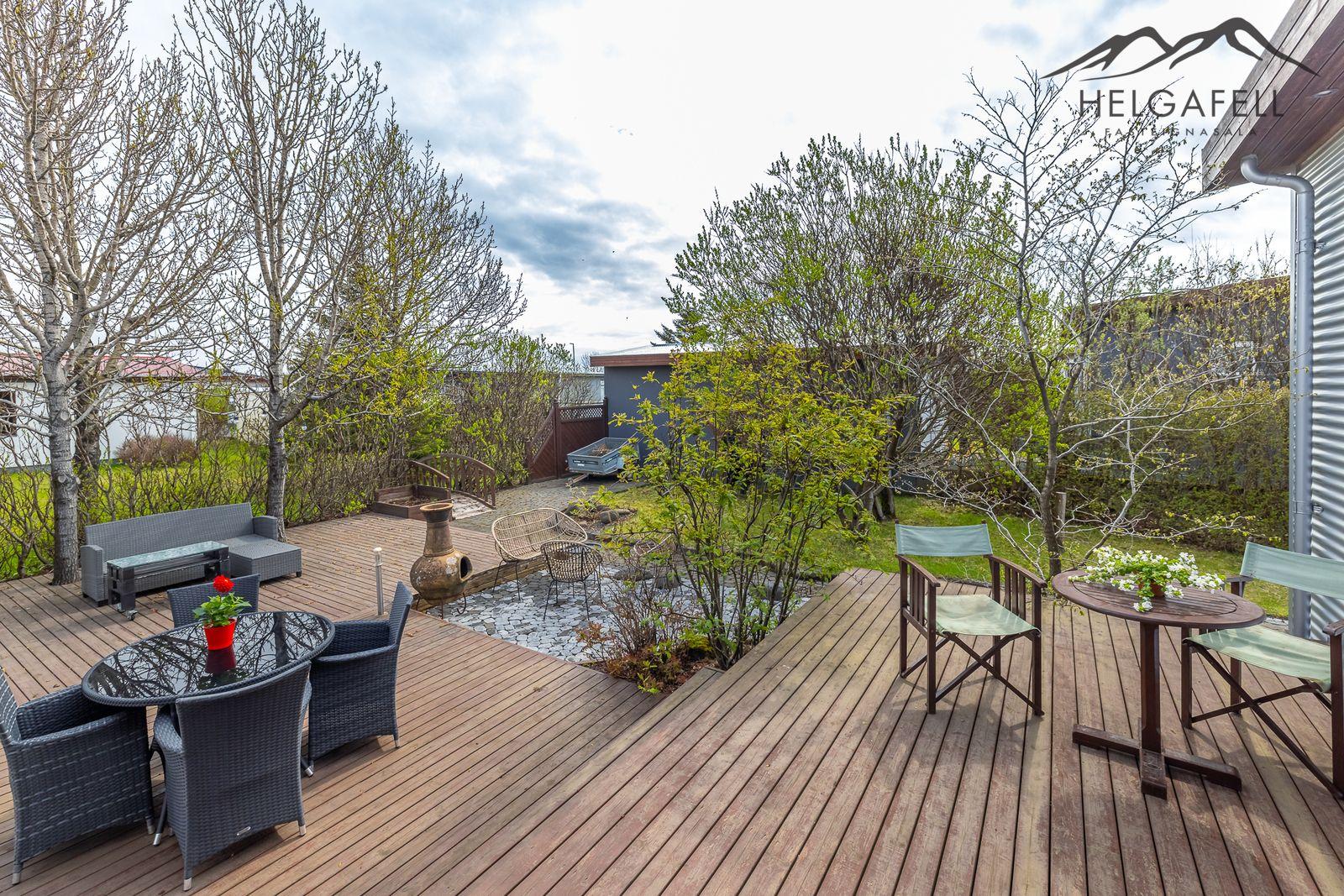 Lóð: Skjólgóð og fallega 758,5 fm. lóð. Framan við húsið er lóðin hellulögð að mestu leit, hellur með fram húsinu og gras, á baklóð er stór suðaustur sólpallur með heitum potti.