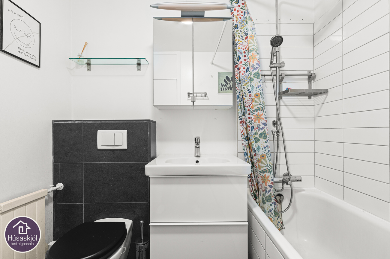 Baðherbergi: Endurnýjað fyrir ca. 10 árum. Flísar á gólfi. Upphengt salerni, vaskur á innréttingu og baðkar. Tengingar fyrir þvottavél eru innan baðherbergis. Merki um myglu má sjá, líklega vegna þess að skolpvatn úr þvottavélinni er leitt beint í baðkarið.