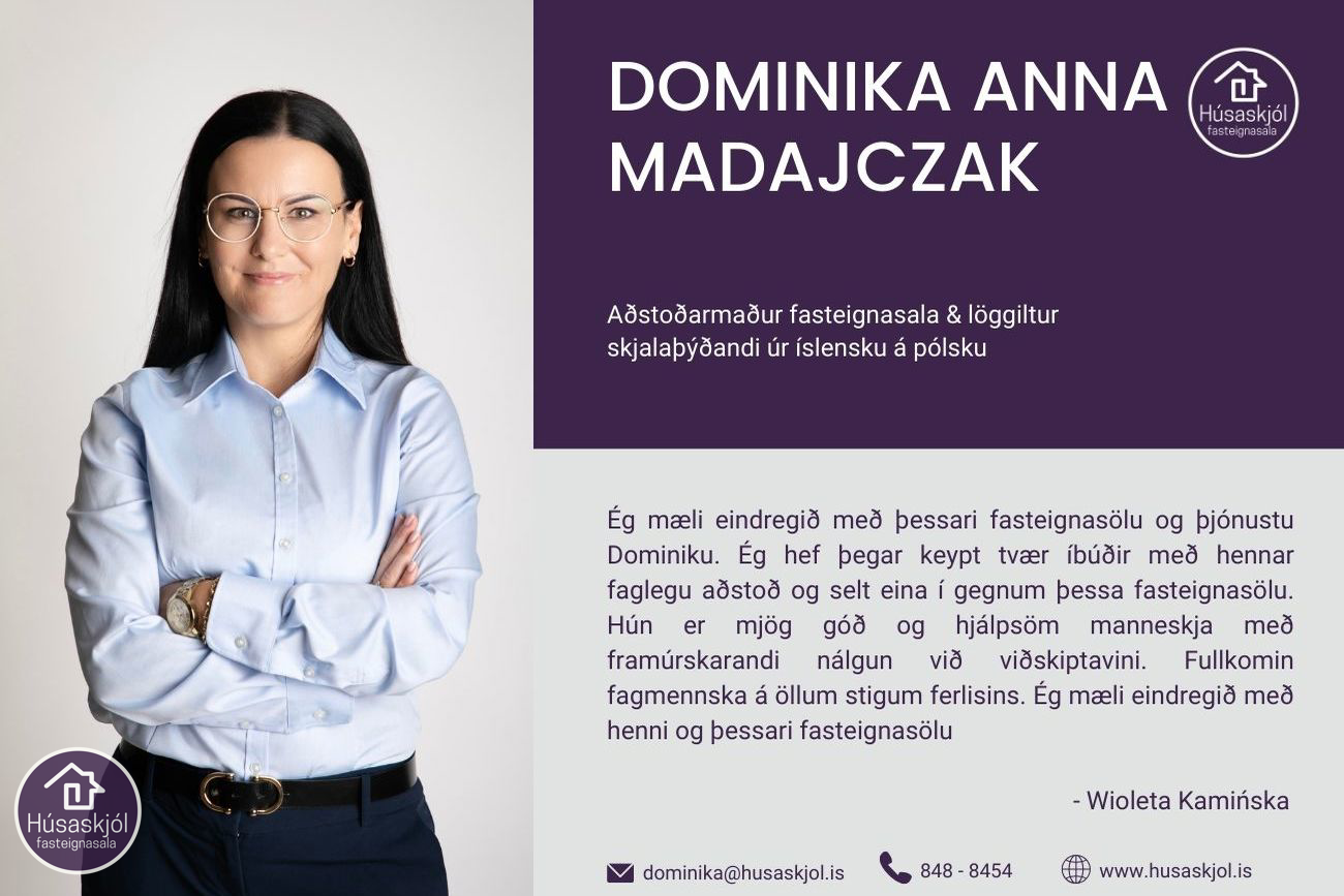 Lóð: Samkvæmt upplýsingum frá aðalfundi 2025 var lóðin síðast malbikuð árið 2020. Einnig kom fram að stífla sé í skolpi sem húsfélagið þarf að láta kanna nánar. Húsfélagið hyggst jafnframt skoða ástand bílastæða og endurnýja þau í náinni framtíð.Allar nánari upplýsingar veitir Ásdís Ósk Valsdóttir löggiltur fasteignasali í email: asdis@husaskjol.is eða í síma frá 09:00-17:00 á virkum dögum: 863-0402 og aðstoðarmaður fasteignasala Dominika Anna Madajczak dominika@husaskjol.is eða i síma 848-8454.