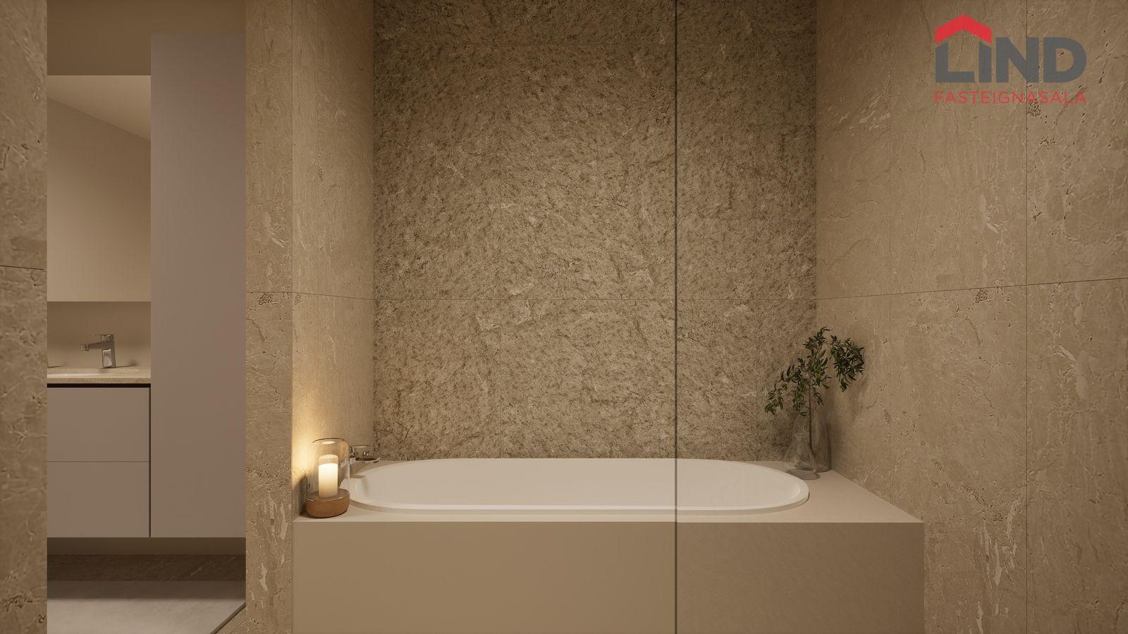 Baðherbergi: Flísar á gólfi og vegg að hluta. Rúmgóð sturta með sturtu gleri ásamt baðkari. Innrétting frá Selós. Borðplötur eru sér smíðaðar úr Dekton stein 20mm þykkar með undirlímdum vaski.
