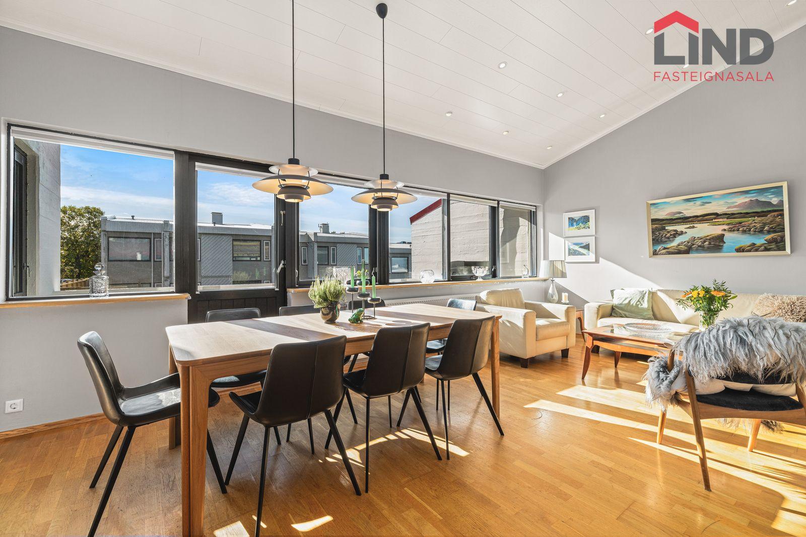 Stofa: björt og rúmgóð með aukinni lofthæð, með parketi á gólfi.