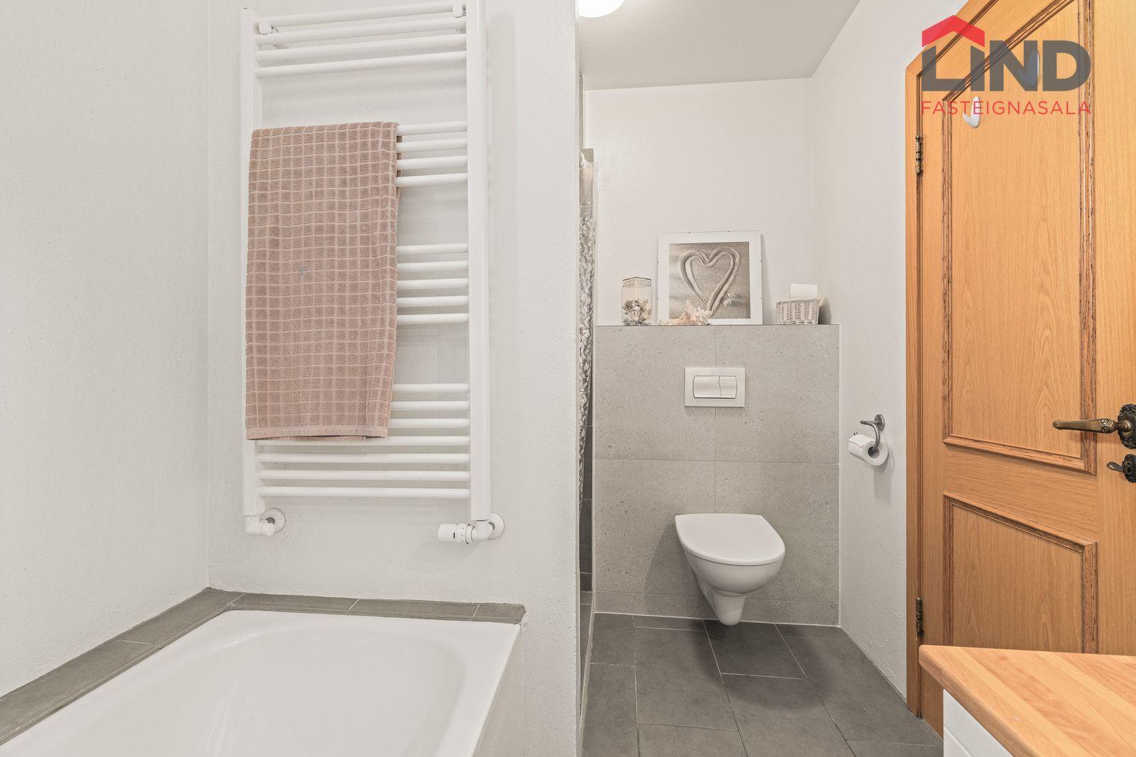 Baðherbergi: upphengd hvít innrétting með handlaug. Flísalögð sturta, baðkar, handklæðaofn og upphengt salerni. Gólfið er flísalagt.
