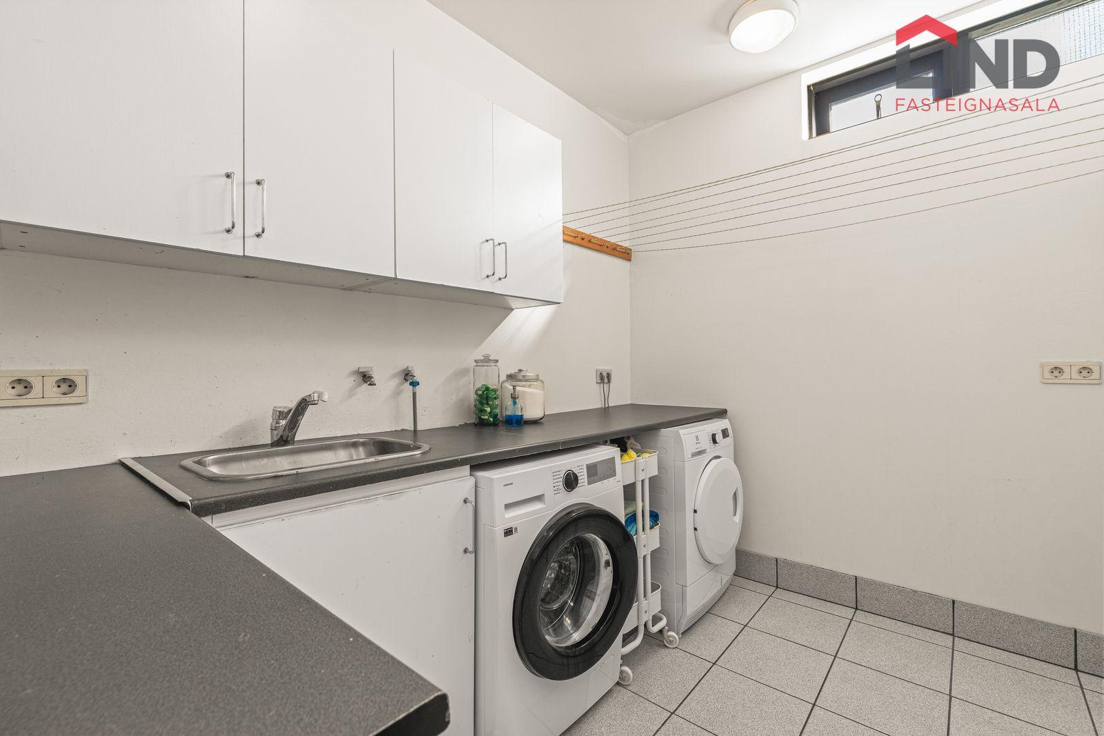 Þvottahús: hvít innrétting með vinnuborði. Tengi fyrir þvottavél og þurrkara. Gólfið er flísalagt.
