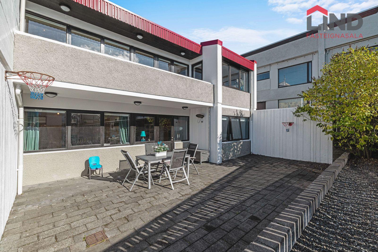 Garður og lóð: hellulögð skjólsæl suður verönd er fyrir aftan hús og einnig er hellulögð verönd að framan.
