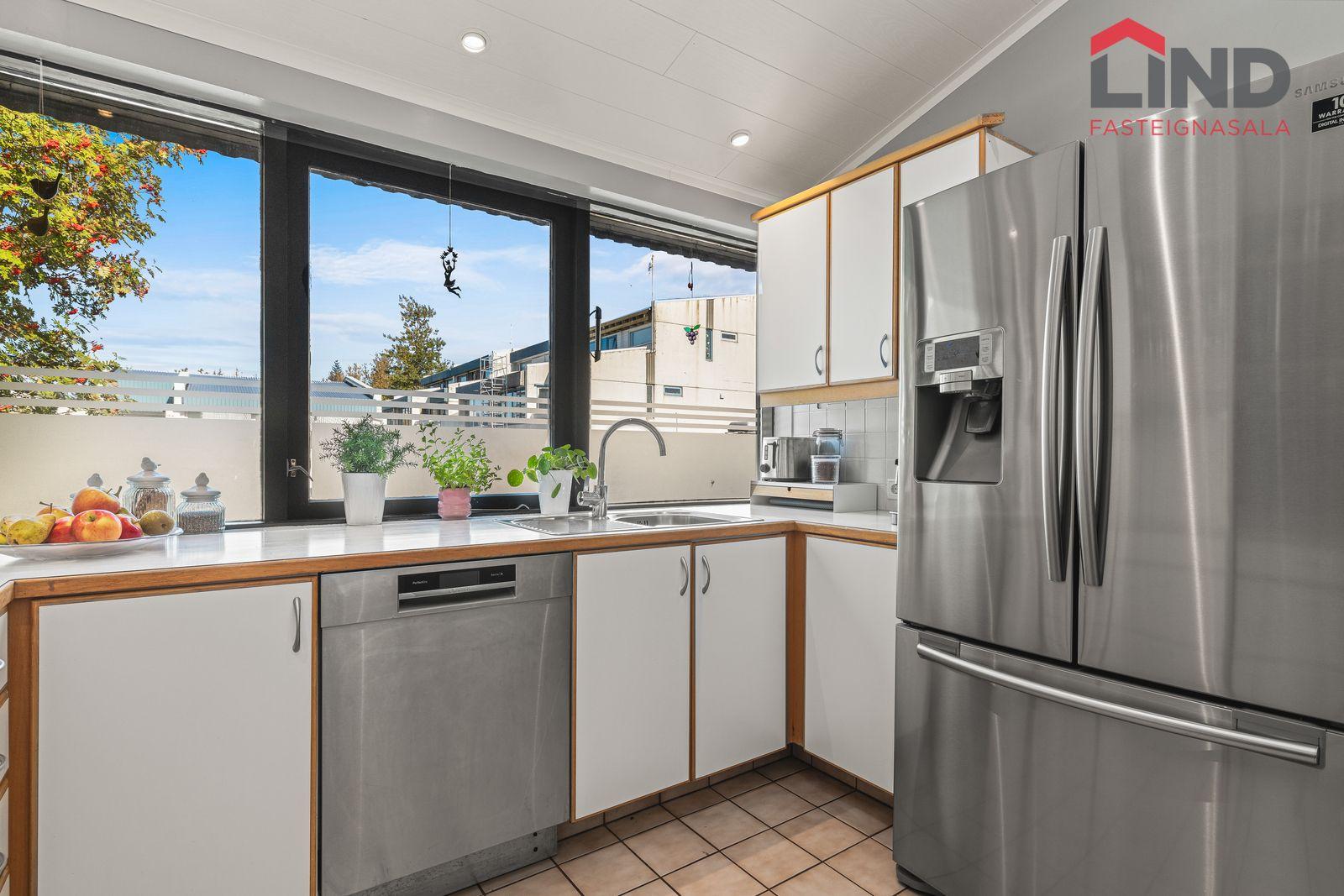 Eldhús: með hvítri og viðarlitaðri innréttingu með góðu skápaplássi. Bakaraofn í vinnuhæð og spanhelluborð með gufugleypi í innréttingu fyrir ofan. Gólfið er flísalagt.