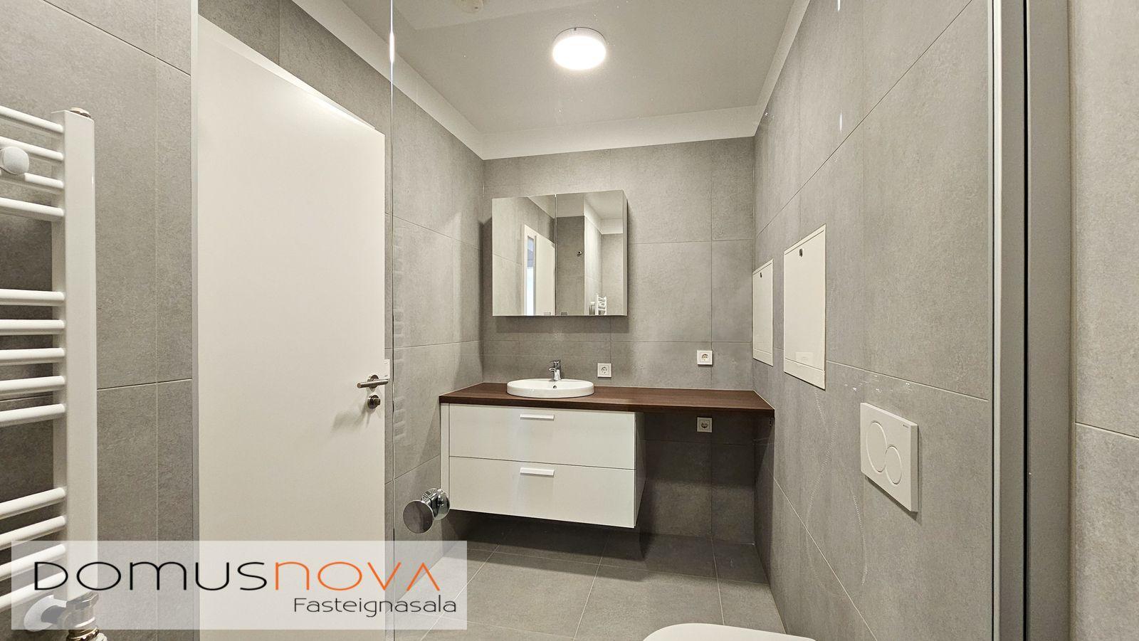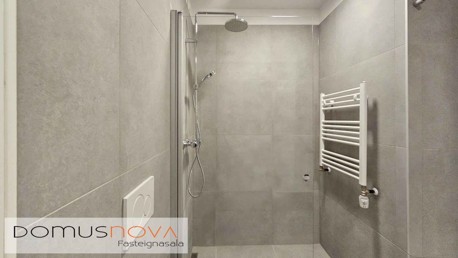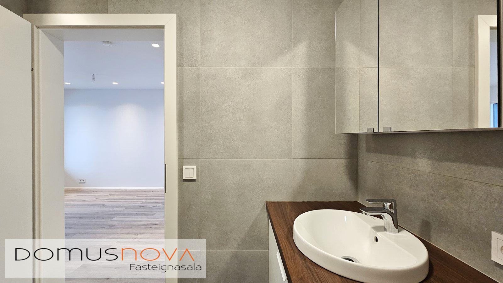 Baðherbergi: Hvít innrétting með brúnni borðplötu og hvítri handlaug. Speglaskápur yfir handlaug. Upphengt salerni með hæglokandi setu, WALK IN sturta og handklæðaofn. Hitastýrð blöndunartækin frá Tengi. Aðstaða fyrir þvottavél og þurrkara. Veggflísar og gegnheilar flísar á gólfi.