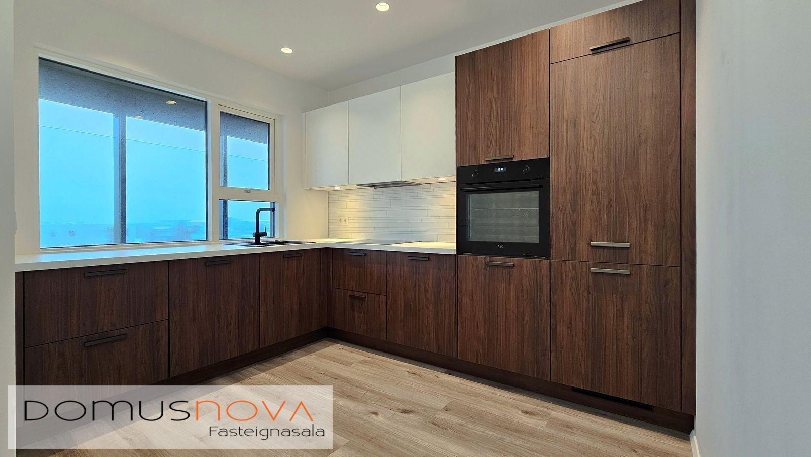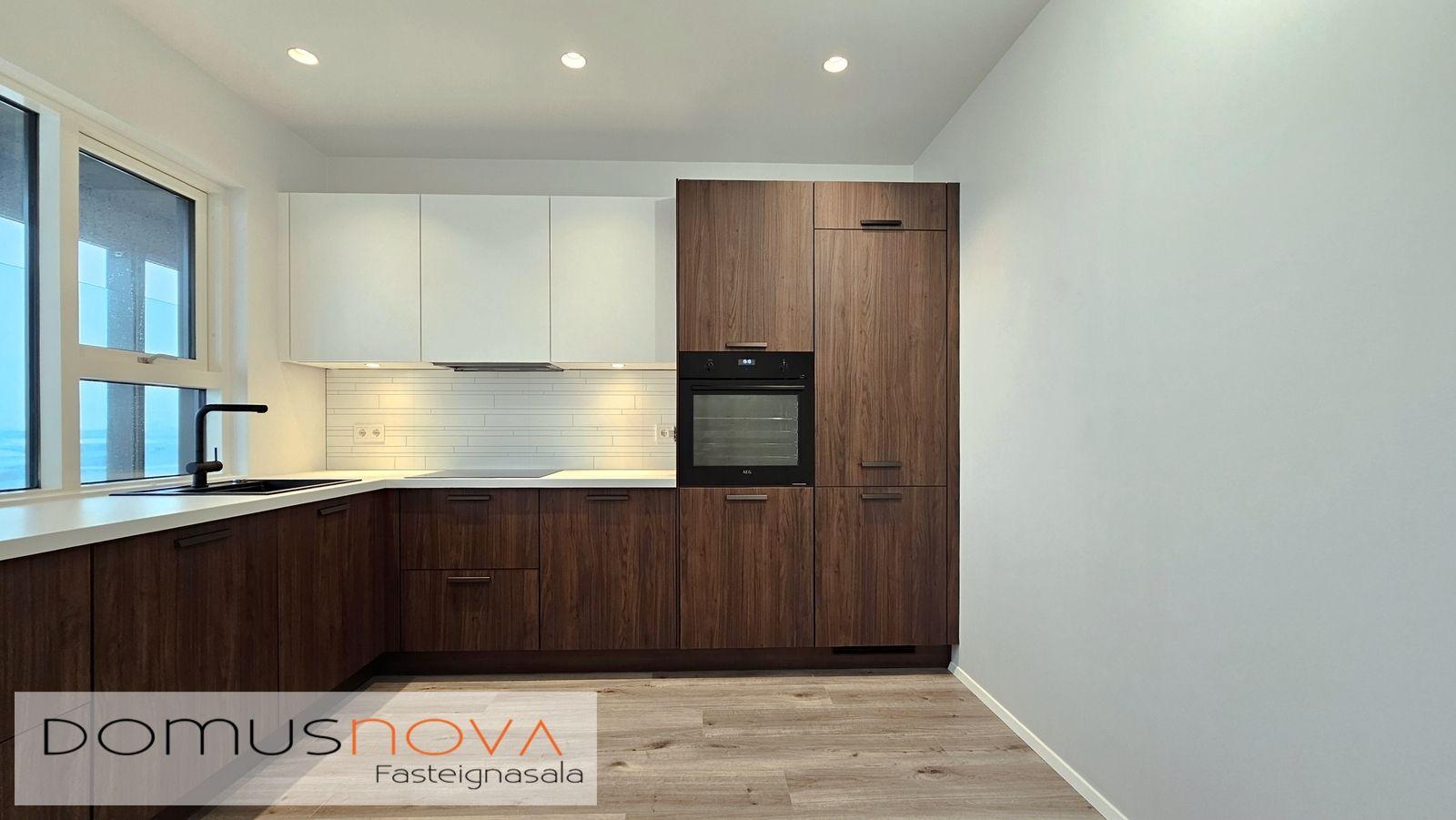 Eldhús: Vönduð brún Nobilia innréttingar með hvítum efri skápum frá GKS innréttingum. Raftæki frá AEG, veggofn, spanhelluborð, innbyggð uppþvottavél og innbyggður kæliskápur með frysti. Vifta er frá Elica. Eldhúsvaskur og blöndunartæki er svart að lit og er frá Tengi. Harðparket á gólfi.