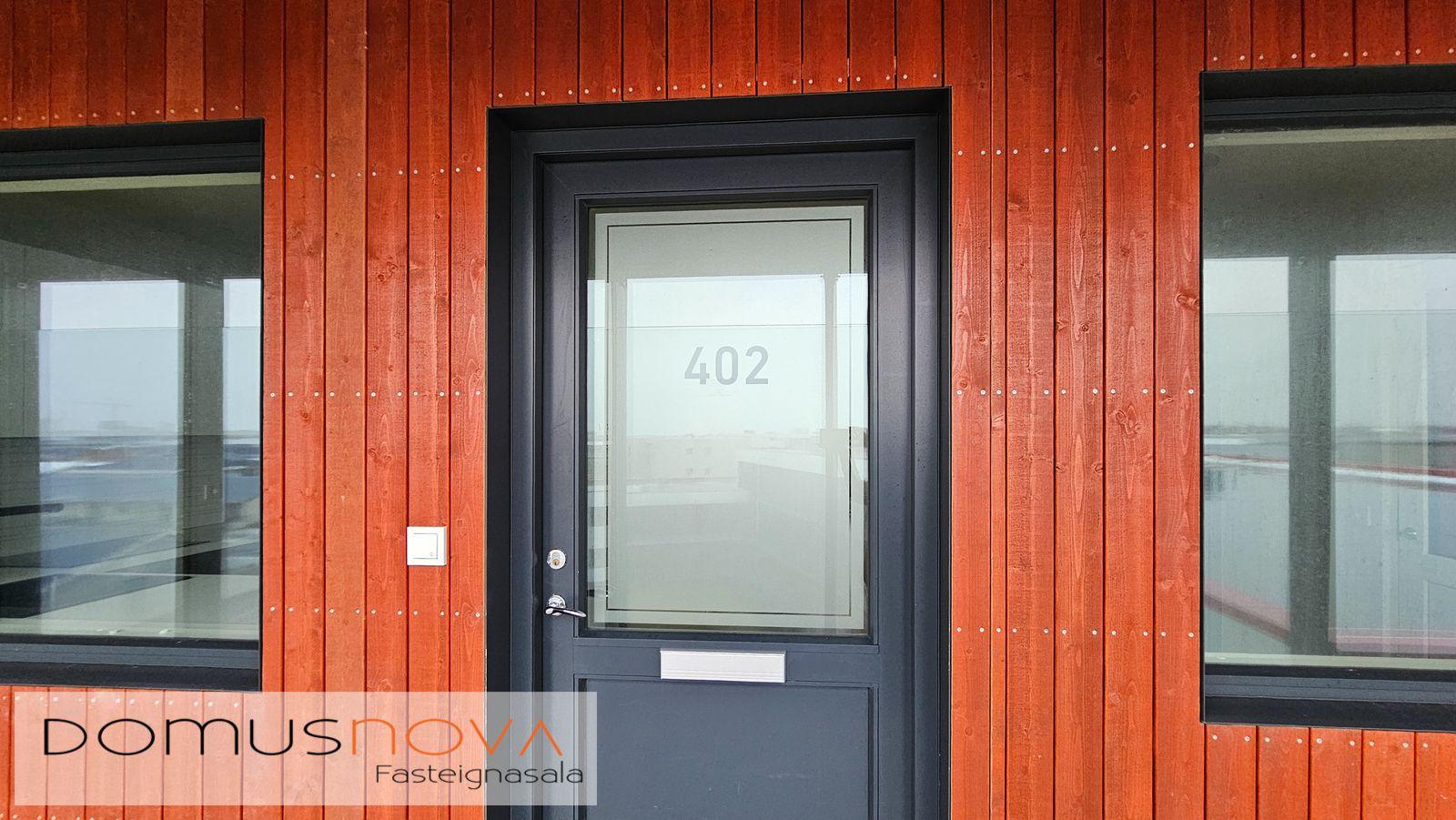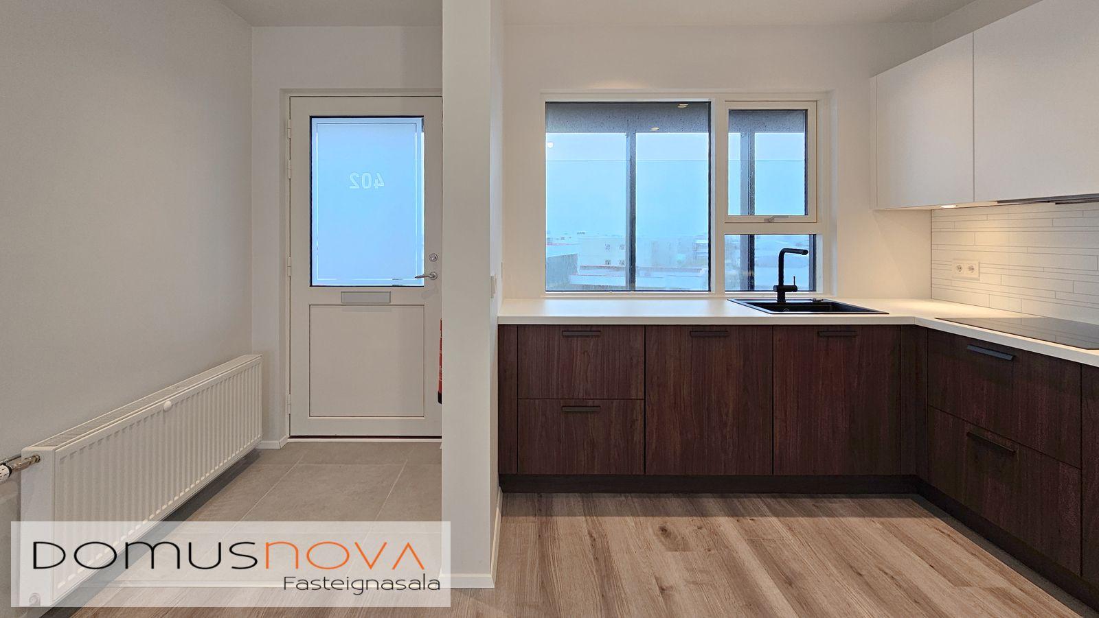 Íbúð 402 er skráð 57.9 fm.,þar af geymsla 4,6 fm. Sérinngangur er inn í eignina og svalir til norðurausturs. Innan eignar er anddyri, stofa, eldhús, eitt herbergi og baðherbergi þar sem einnig er þvottarými.