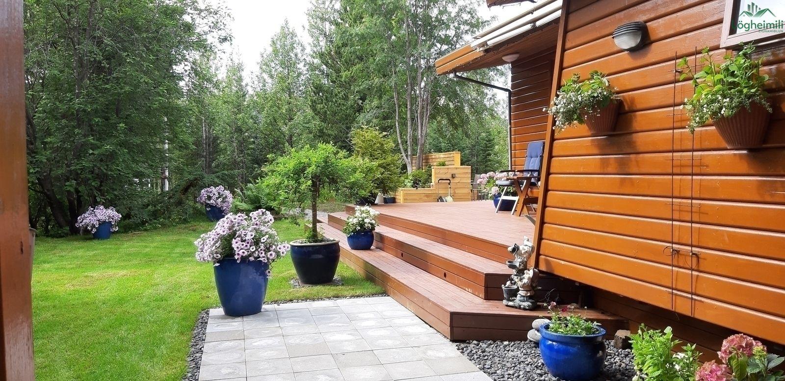 Hægt er að ganga út á norðurhluta lóðar frá baðherbergi.