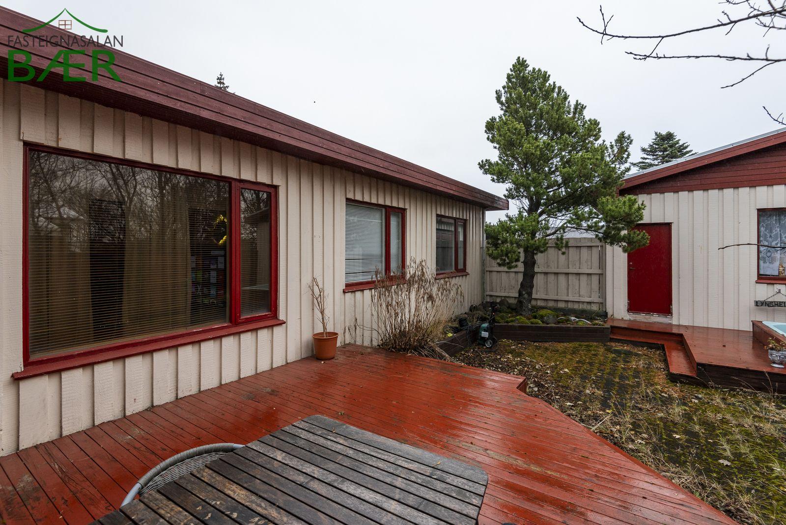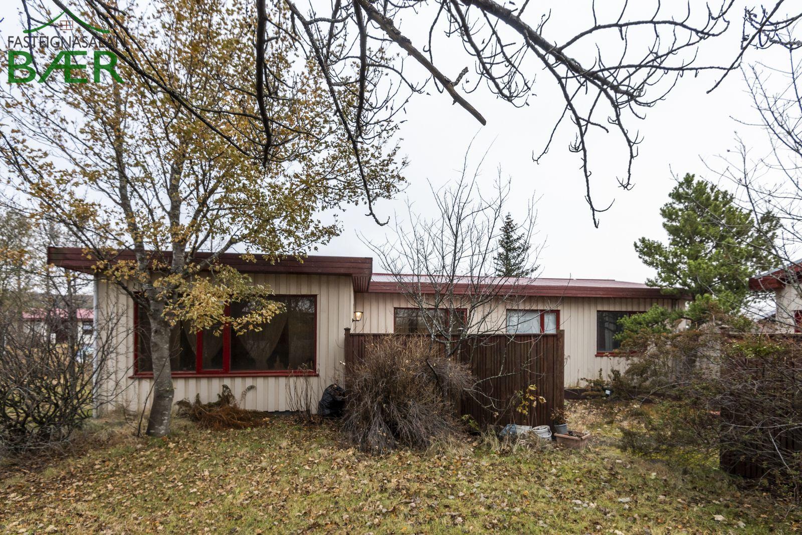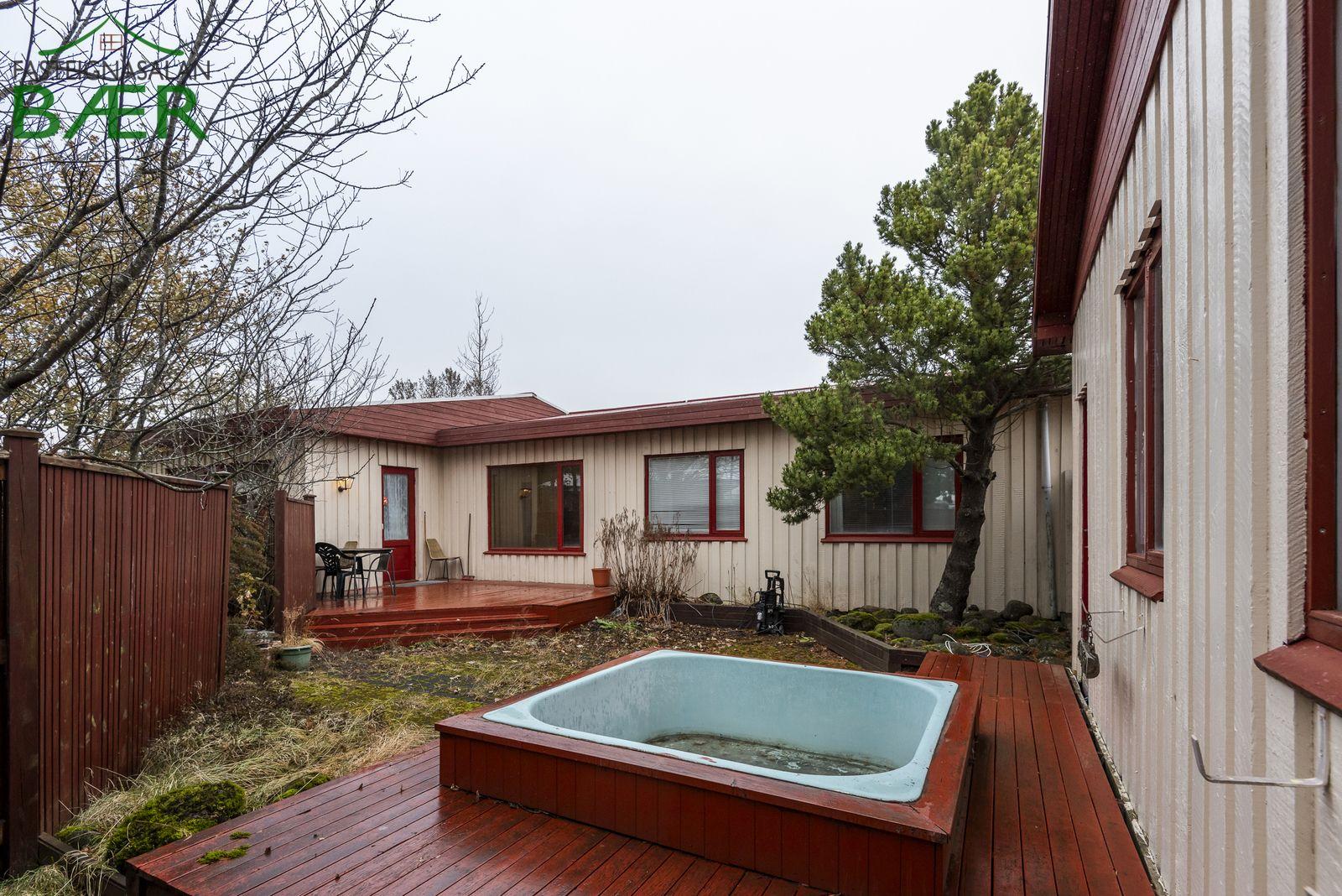 Nánari lýsing: Forstofa, fjögur svefnherbergi, stofa, eldhús, sjónvarpshol, baðherbergi, gestasnyrting, þvottaherbergi og bílskúr. Forstofa með flísum á gólfi og fataskáp. Gestasnyrting er inn af forstofu flísalögð í hólf og gólf og með glugga. Eldhús með flísum á gólfi, eldri innrétting og borðkrókur. Þvottaherbergi er inn af eldhúsi með flísum á gólfi, innréttingu og lúgu upp í þakgeymslu sem er yfir nánast öllu húsinu. Stofa/borðstofa með parket á gólfi og útgengi út á sólpall í suður. Sjónvarpshol með flísum á gólfi. Baðherbergi er flísalagt í hólf og gólf, hornbaðkar með sturtu, innrétting og salerni. Svefnherbergin eru 4 eitt með fataskápum, tvö með parketi og tvö með kork á gólfum. Bílskúr er rúmgóður og bjartur með geymslulofti yfir hluta skúrsins, tvær gönguhurðar og ein bílskúrshurð með rafmagns opnun. Húsið hefur verið í góðu viðhaldi: Þakkantur endurnýjaður 2021 á húsi og bílskúr, timburklæðning utan á húsi var endurnýjuð 2021 að stórum hluta, ásamt einum glugga í austur. Húsið er í enda götunnar og er opið svæði vestan við húsið sem ekki verður byggt á. Flott eign á góðum stað og stutt í alla þjónustu.